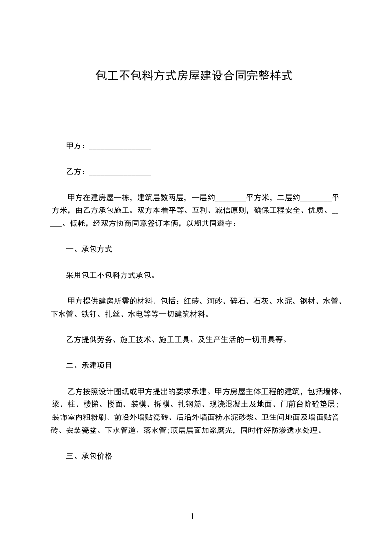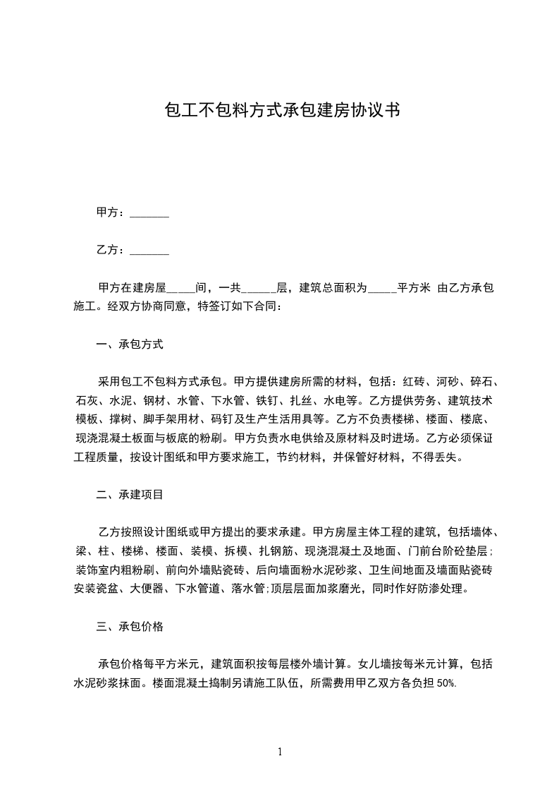 甲方在建房屋一栋,建筑层数两层,一层约________平方米,二层约________平方米,由乙方承包施工。双方本着平等、互利、诚信原则,确保工程安全、优质、_____、低耗,经双方协商同意签订本俩,以期共同遵守: