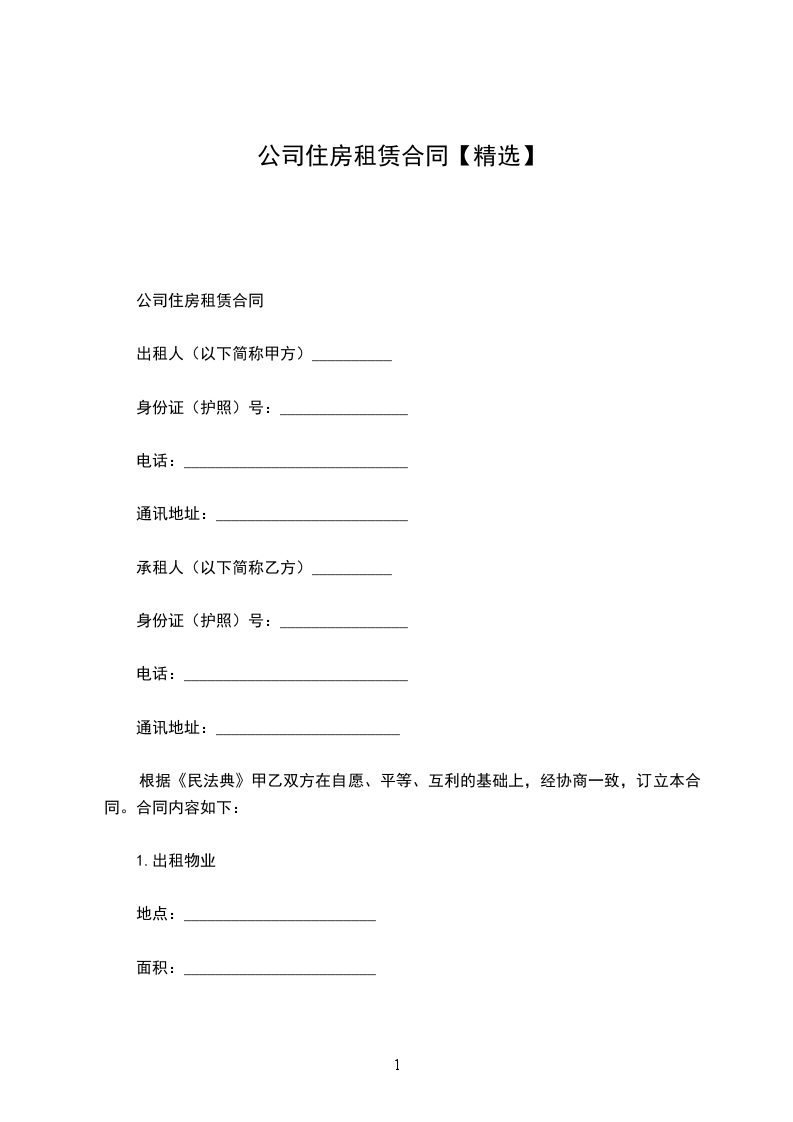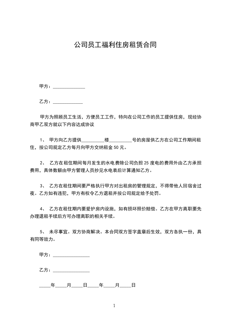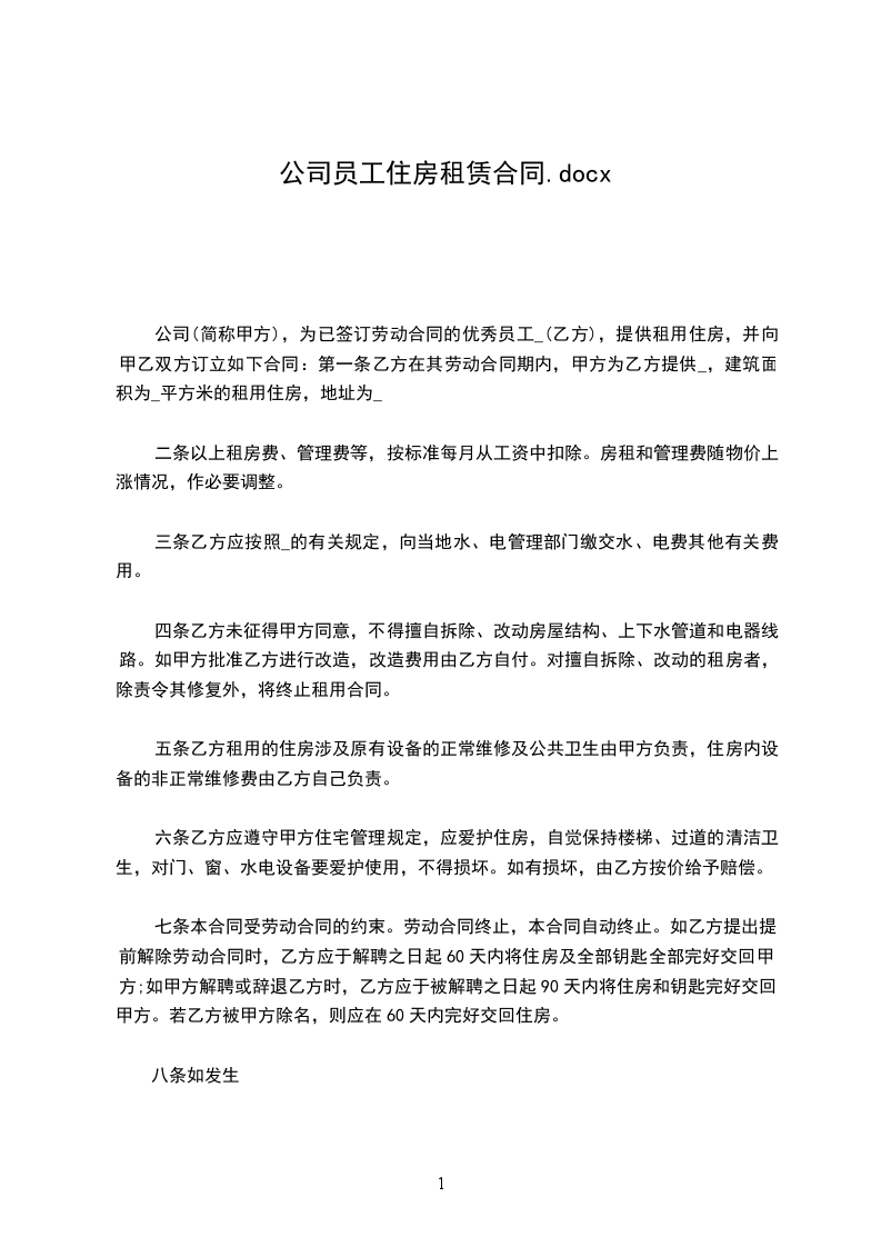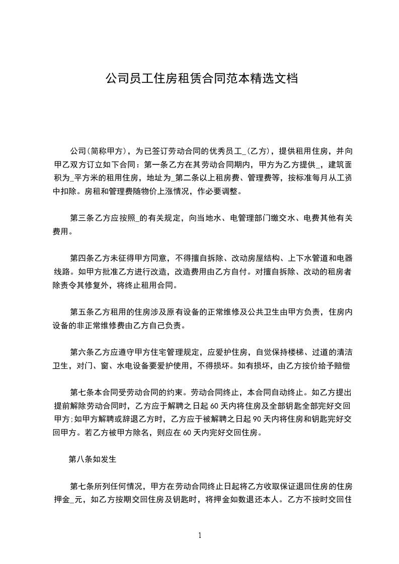 公司(简称甲方),为已签订劳动合同的优秀员工_(乙方),提供租用住房,并向甲乙双方订立如下合同:第一条乙方在其劳动合同期内,甲方为乙方提供_,建筑面积为_平方米的租用住房,地址为_