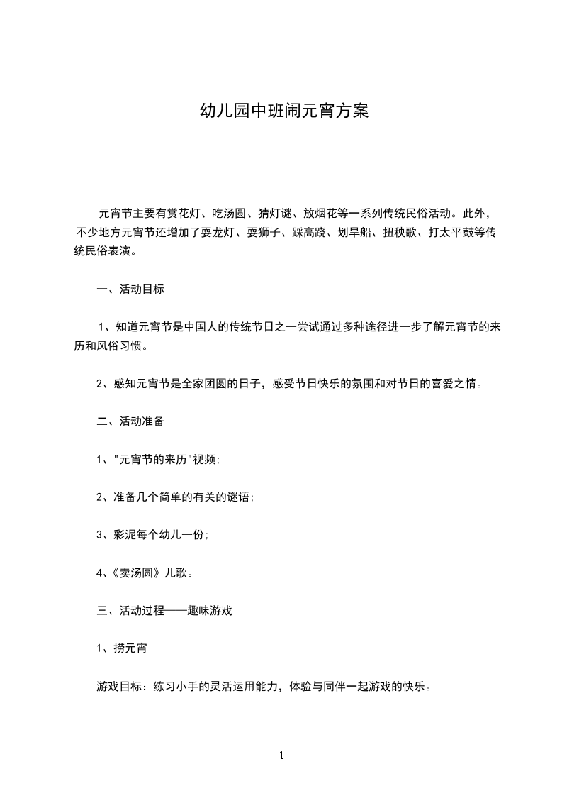 2、知道正月十五是中国传统的元宵节,了解元宵节的来历和一些习俗。活动准备:干米粉、小盘子、大盘子。活动过程:一、猜一猜一一通过猜灯谜的游戏形式导入本次活动。共同来猜谜:请幼儿介绍谜而,让同伴猜。