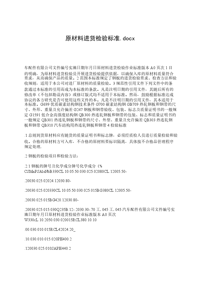 车配件有限公司文件编号实施日期年月日原材料进货检验作业标准版本A0页次1目的明确,为原材料进货检验员开展进货检验提供依据,以确保入库的原材料质量符合要求,从而确保产品的质量。2范围本标准规定了钢板的进货检验要求、检查方法和验收规则,适用于本公司对进厂原材料的质量检验。3规范性引用文件下列文件中的条款通过本标准的引用而成为本标准的条款。凡是注明日期的引用文件,其随后所有的修改单(不包括勘误内容)或修订版式均不适用于本标准。然而,鼓励根据标准达成协议的各方研究是否可使用这些文件的本。凡是不注明日期的引用文件,其本适用于本标准。G699优质碳素结构钢技术条件G700碳素结构钢GB709热轧钢板和钢带的尺寸、外形、重量及允许偏差G247钢板和钢带验收、包装、标志及质量证明书的一般规定G1591低合金高强度结构钢QB300热连轧钢板和钢带的包装、标志和质量证明书的一般规定QB301热连轧钢板和钢带的尺寸、外型、重量及允许偏差QB303热连轧钢板和钢带QB310汽车结构用热连轧钢板和钢带4检验标准