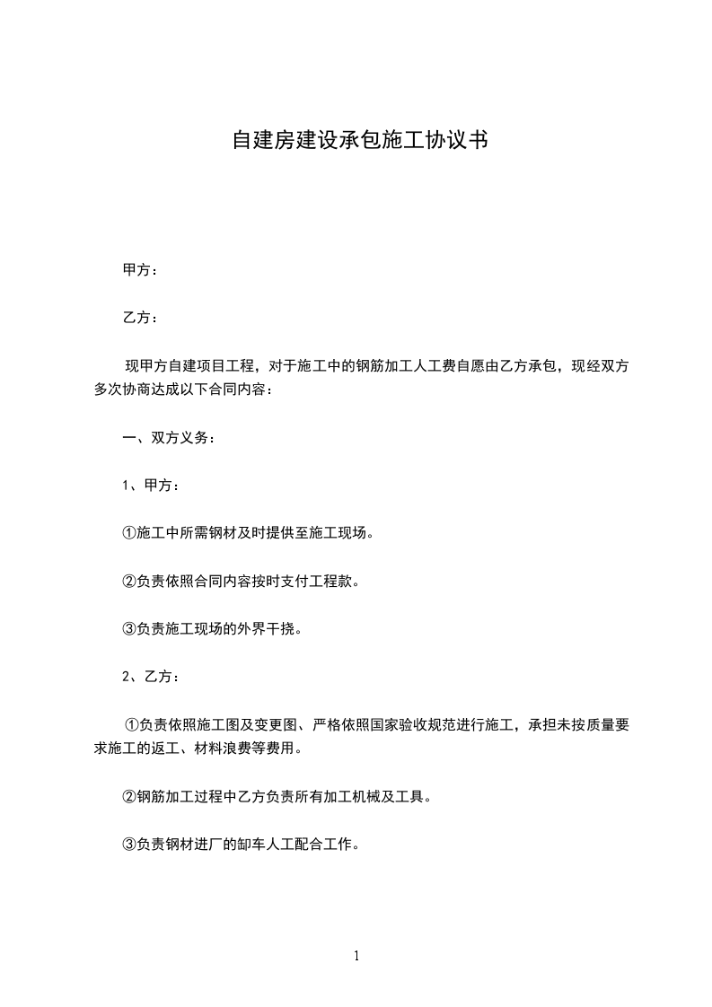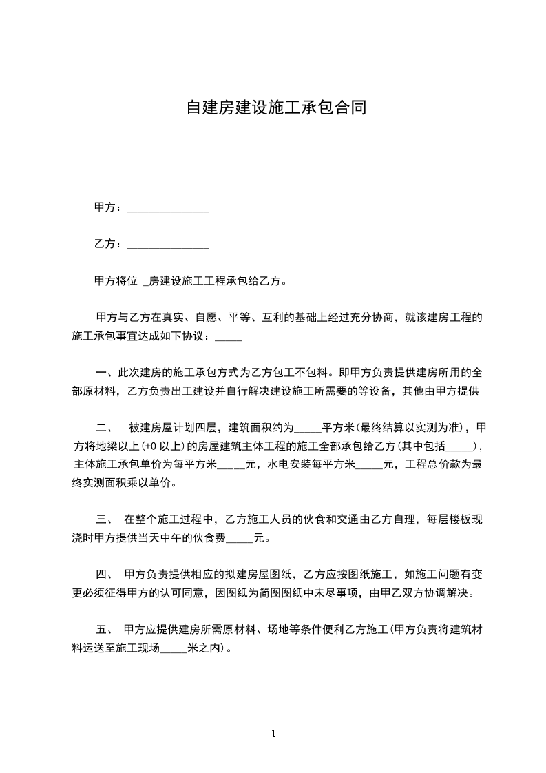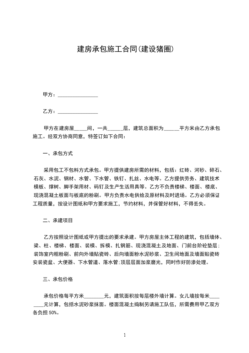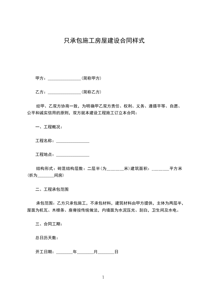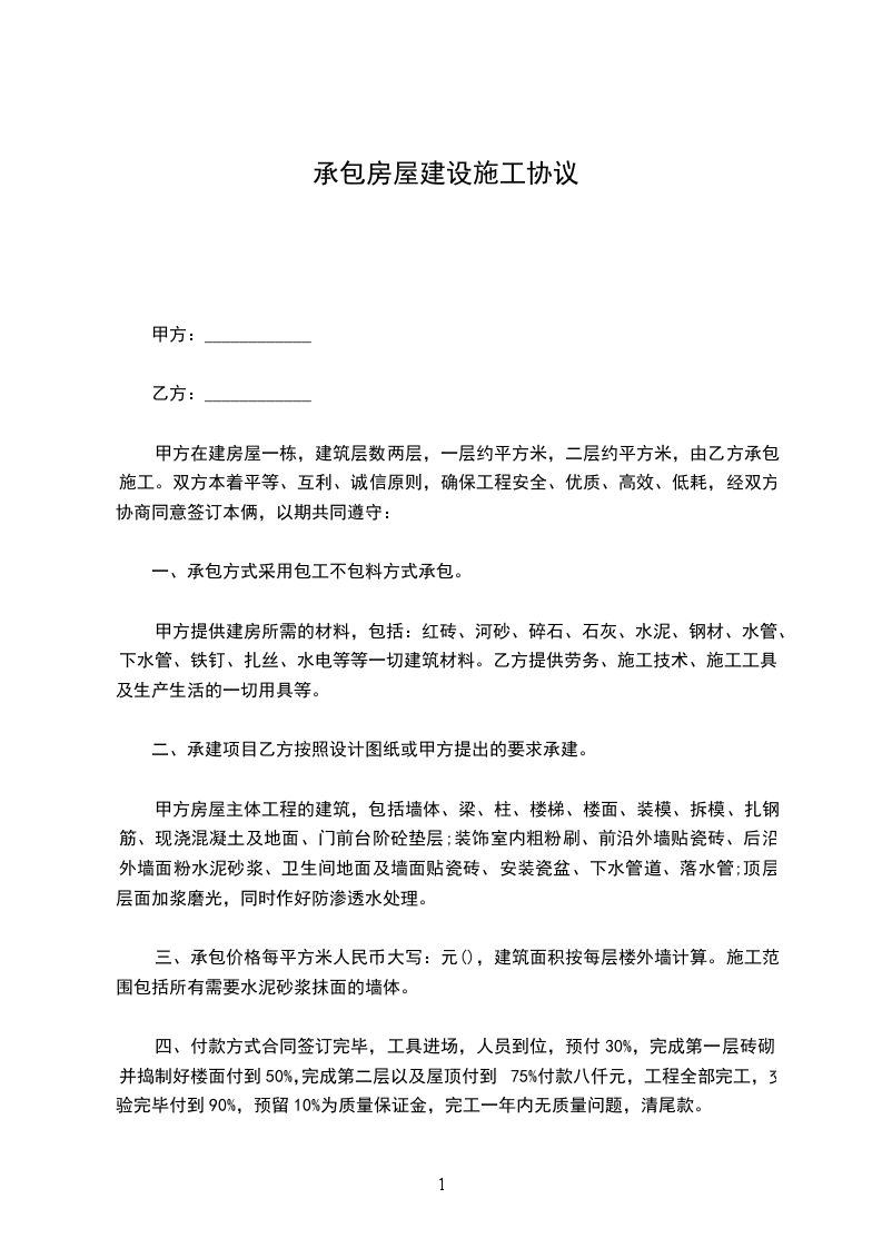 承包范围:乙方只承包施工,不承包材料,建筑材料由甲方提供,主体为两层半,屋面为机瓦、木檩条、座脊按传统做法,内墙面为水泥压光、刮白,卫生间及水电。