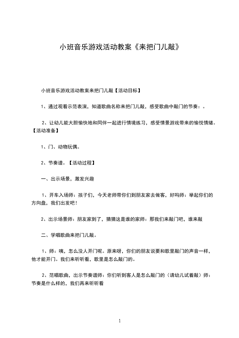 1、通过观看示范表演,知道歌曲名称来把门儿敲,感受歌曲中敲门的节奏:。