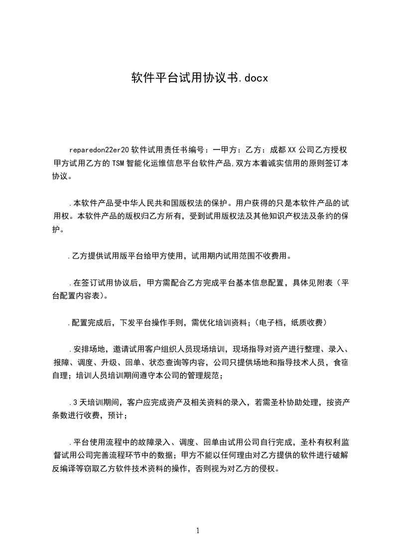 reparedon22er20软件试用责任书编号:一甲方:乙方:成都XX公司乙方授权甲方试用乙方的TSM智能化运维信息平台软件产品,双方本着诚实信用的原则签订本协议。