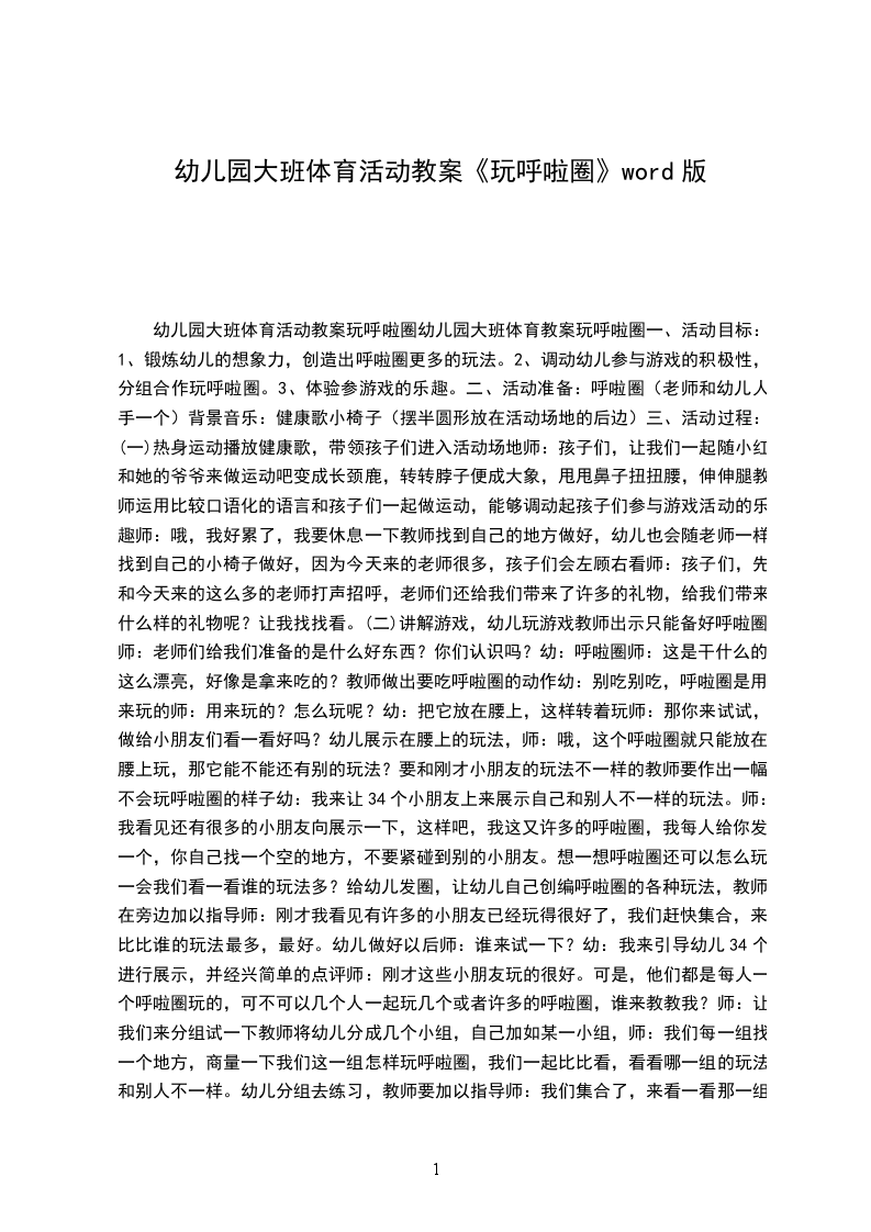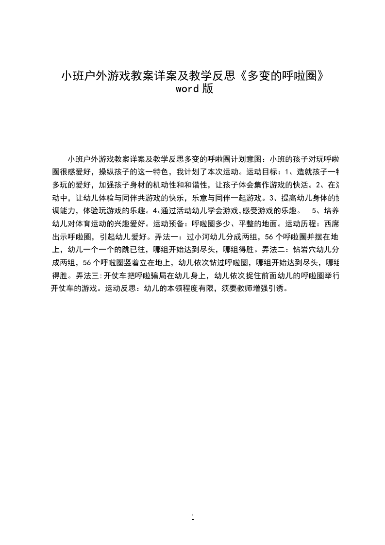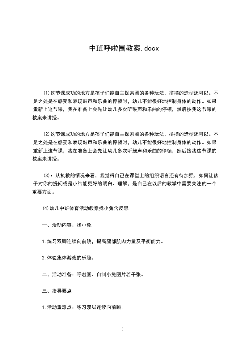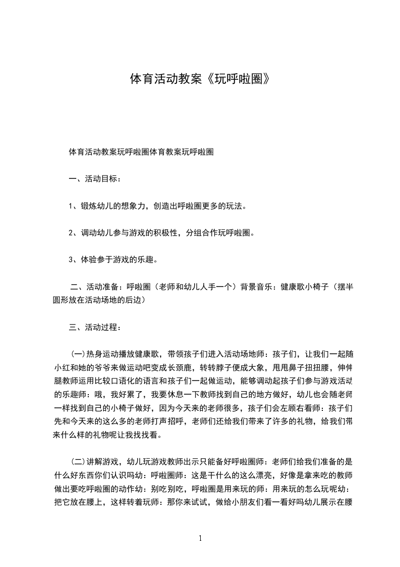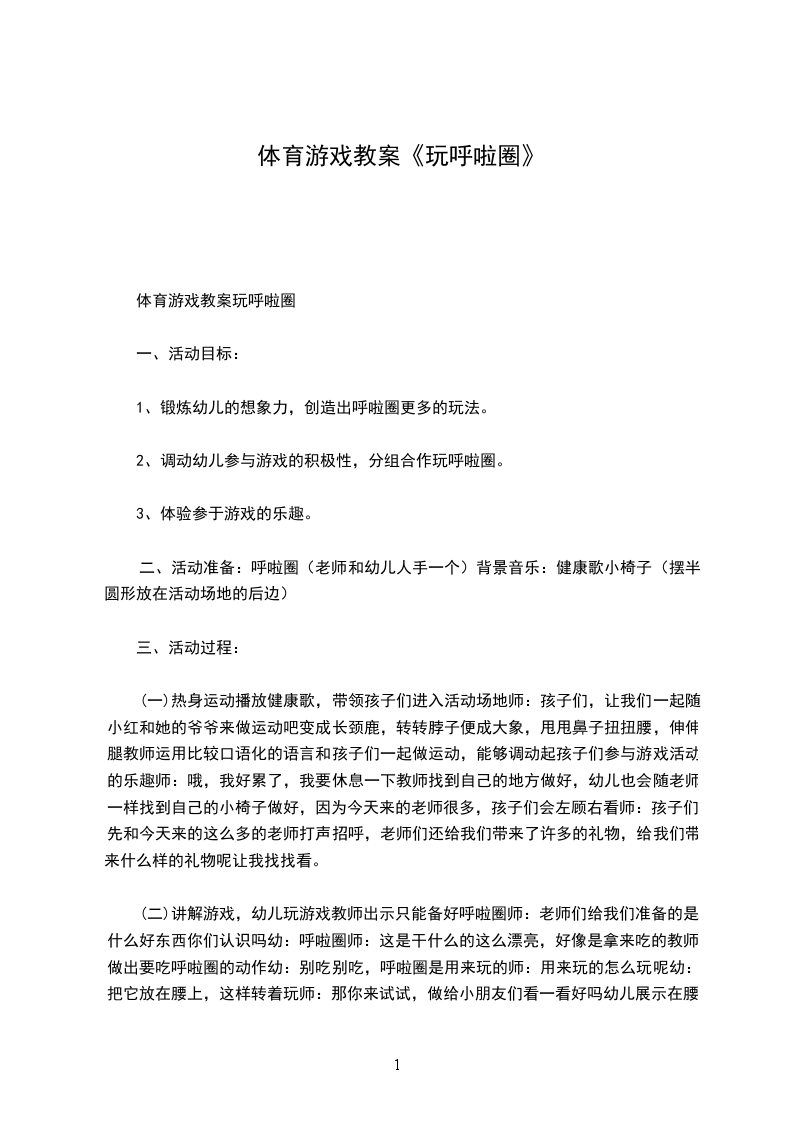 (13)中班教案呼啦圈含反思活动目标:1增进头、身体、手、脚的协调能力。2体会竞赛的乐趣。3提高动作的协调性与灵敏性。4喜欢与同伴合作,体验运动的挑战与快乐。活动准备:1中型呼啦圈、棍子,快乐圆圈圈玩法。活动过程:1将呼啦圈绑在棍子上,固定好后把呼啦圈吊起来。2将幼儿分成2到3组。3老师先指导幼儿并示范,如先以青蛙跳的方式跳到呼啦圈前,然后穿过呼啦圈(穿越呼啦圈时,先跨一只脚再缩脖子,另一只脚再跨出);穿越后再用青蛙跳返回,和下一位小朋友拍完手后,下一位小朋友方可跳出。4按序完成,先做完的组即为优胜组。活动建议:1呼啦圈离地面的高度约10厘米左右。2由于呼啦圈会转动,示范时应让圈稳住以便身体顺利穿过。3进行游戏时,要留意幼儿的体力限度并注意安全。延伸活动:可用走平衡木或钻纸箱的方式替代青蛙跳,以增加幼儿的学习经验。活动反思在体育活动中把活泼好动的天性还给孩子,让他们体验运动和游戏带来的快乐,激发他们创造的愿望和激情,这是贯彻课改精神的具体体现。我为这堂课上孩子们参与运动的积极性和合作精神而惊讶,也为真切感受体育课堂能充满生命的活力而惊喜。活动中孩子们兴趣盎然的参与场面和合作探究的专注神态还历历在目。本次活动旨在让幼儿玩,玩出花样,玩得高兴,结构化程度比较低,幼儿非常放得开,想出了多种玩法,有自己玩的,也有多人合作玩的,从始至终,兴趣一直很高。而且,玩的水平也很高,好多孩子学会了在脖子上转、在腿上转等难度很高的动作和连在一起当火车、摆在一起做山洞等合作性很强的玩法。并且,初次学做记录,记得也相当好,既简单又形象。整个活动体现出孩子是主体,孩子的主动发展。37