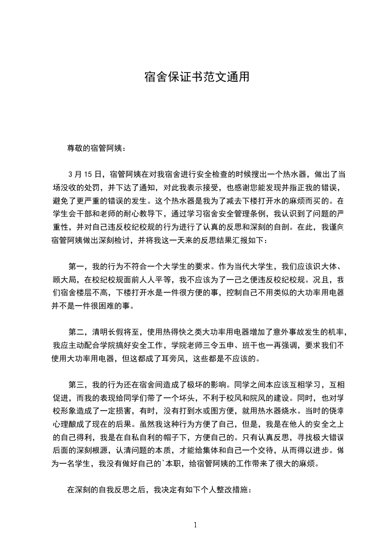 3月15日,宿管阿姨在对我宿舍进行安全检查的时候搜出一个热水器,做出了当场没收的处罚,并下达了通知,对此我表示接受,也感谢您能发现并指正我的错误,避免了更严重的错误的发生。这个热水器是我为了减去下楼打开水的麻烦而买的。在学生会干部和老师的耐心教导下,通过学习宿舍安全管理条例,我认识到了问题的严重性,并对自己违反校纪校规的行为进行了认真的反思和深刻的自剖。在此,我谨向宿管阿姨做出深刻检讨,并将我这一天来的反思结果汇报如下: