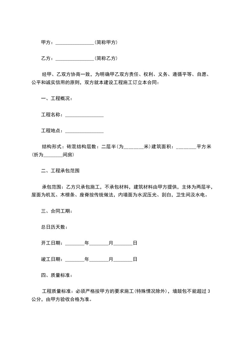 承包范围:乙方只承包施工,不承包材料,建筑材料由甲方提供,主体为两层半,屋面为机瓦、木檩条、座脊按传统做法,内墙面为水泥压光、刮白,卫生间及水电。