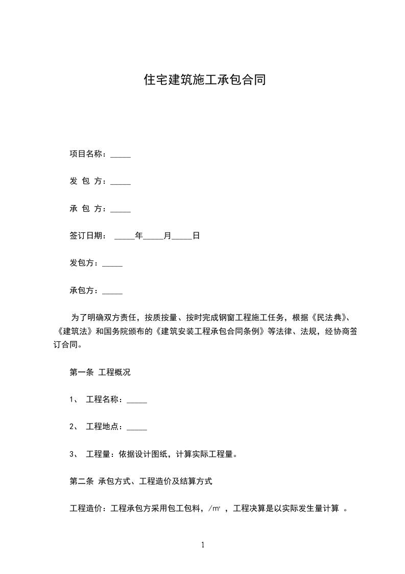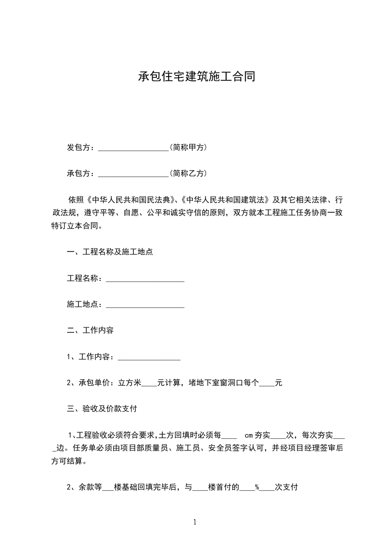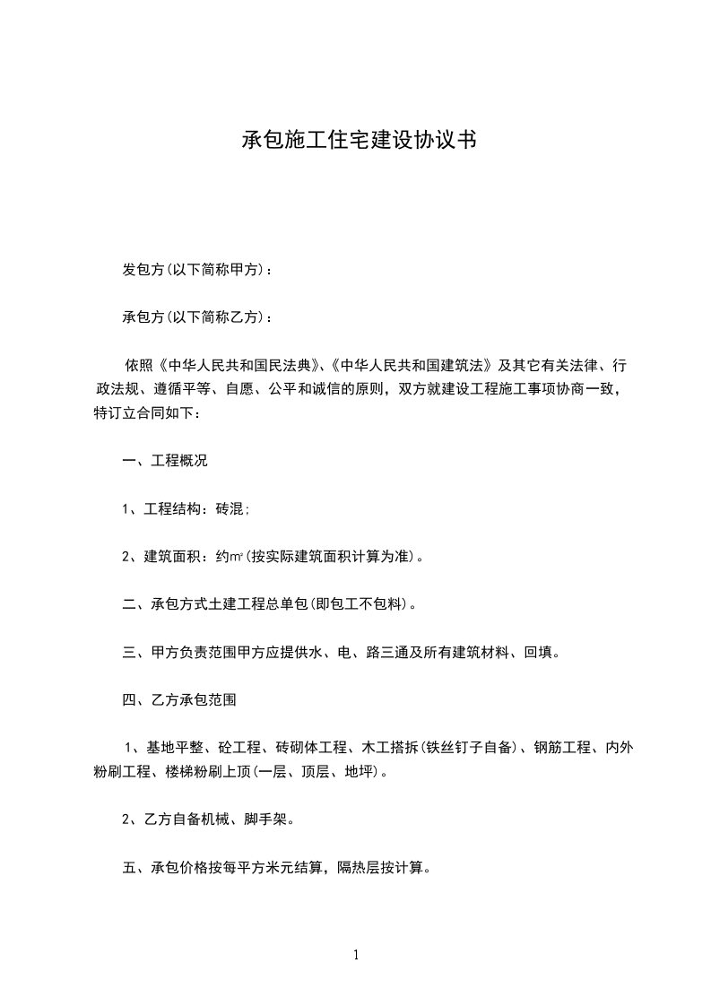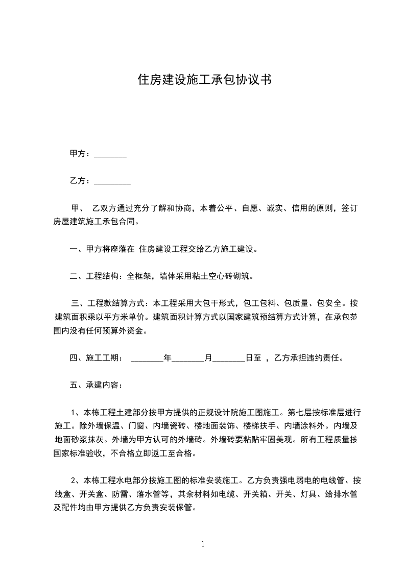只承包施工住房建设合同模板