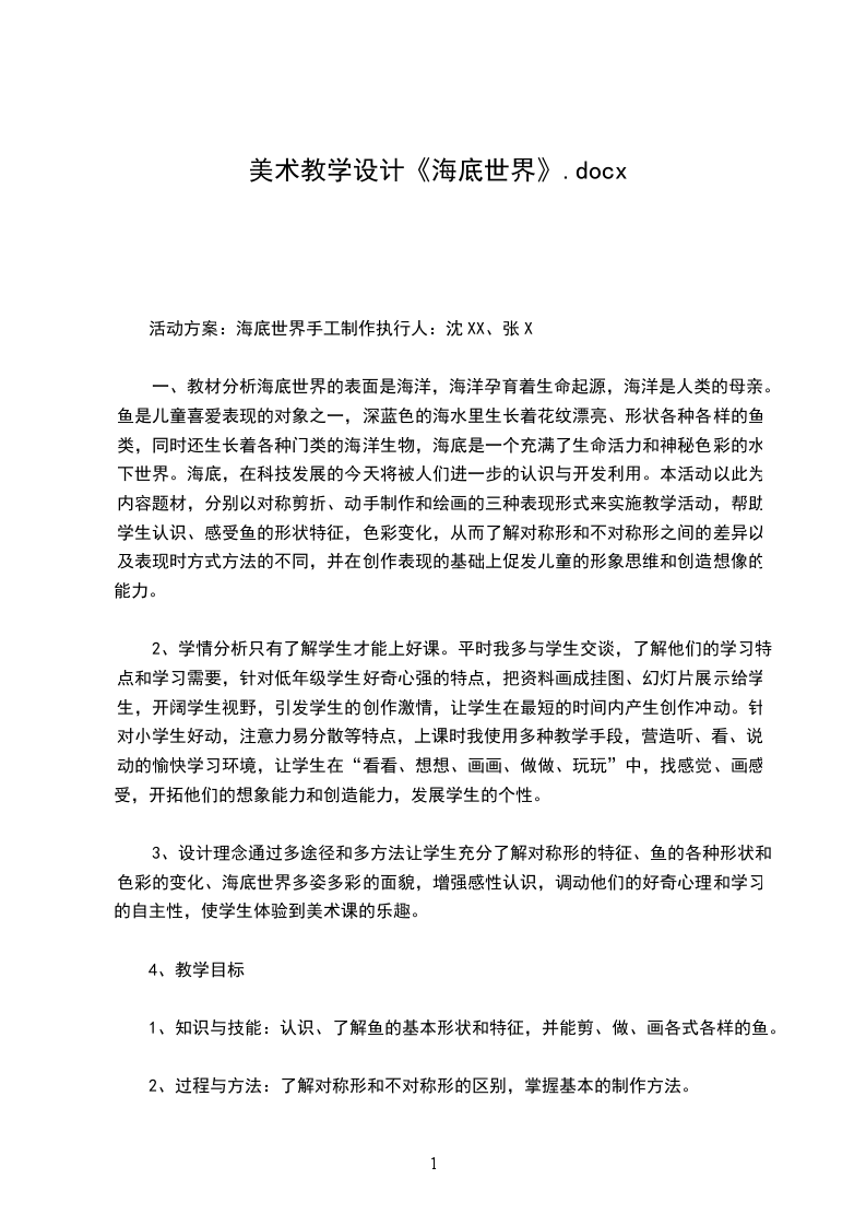活动方案:海底世界手工制作执行人:沈XX、张X