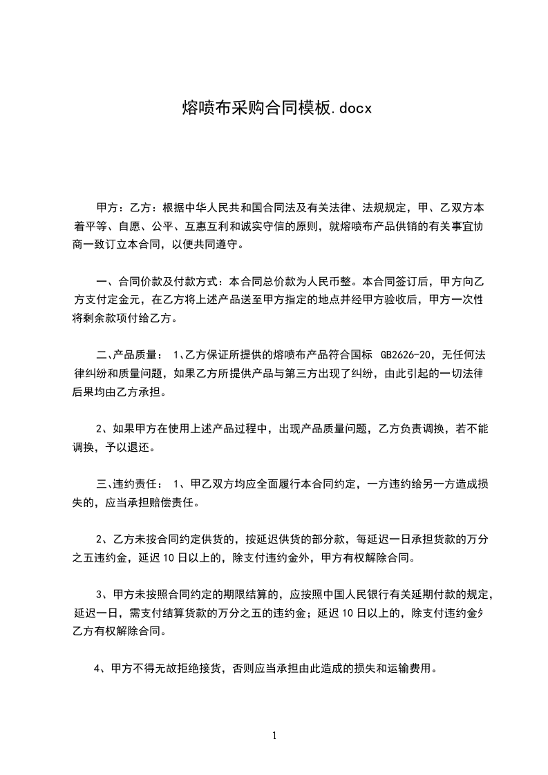甲方:乙方:根据中华人民共和国合同法及有关法律、法规规定,甲、乙双方本着平等、自愿、公平、互惠互利和诚实守信的原则,就熔喷布产品供销的有关事宜协商一致订立本合同,以便共同遵守。