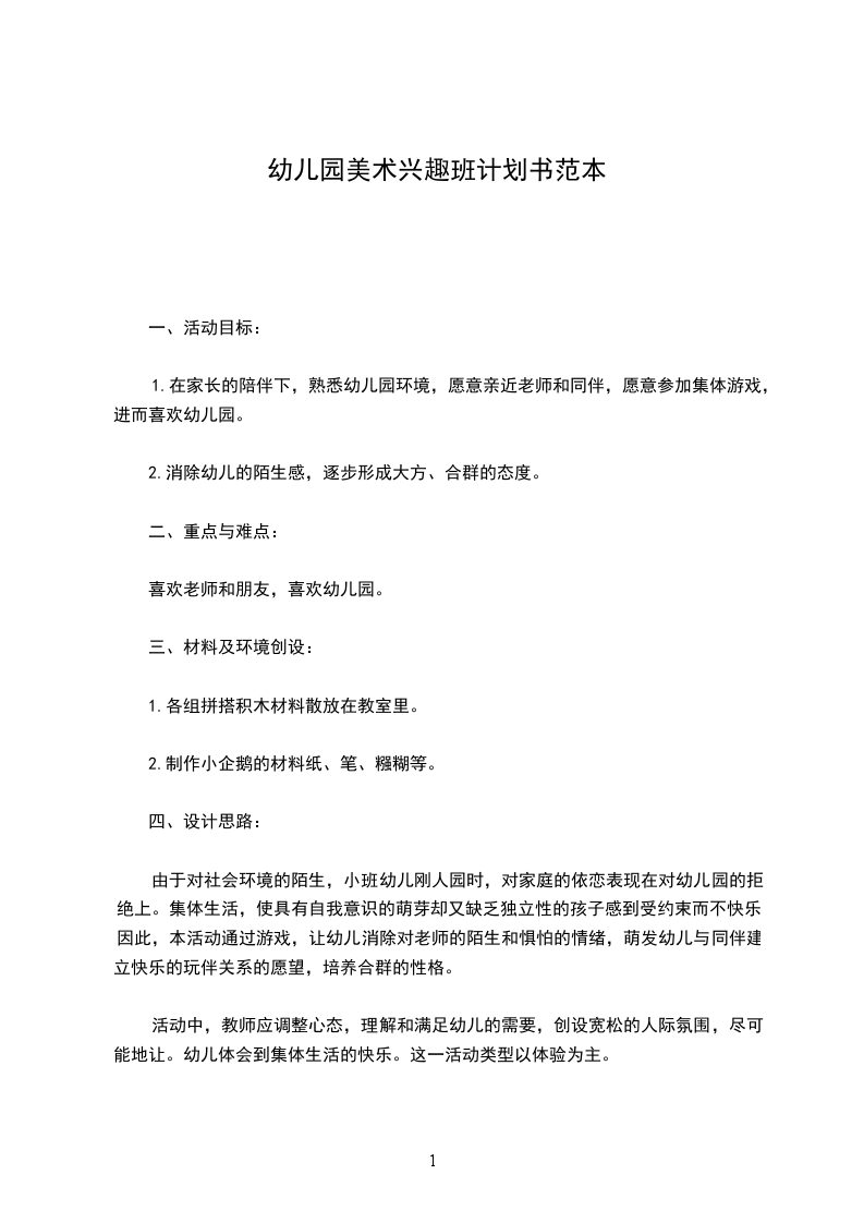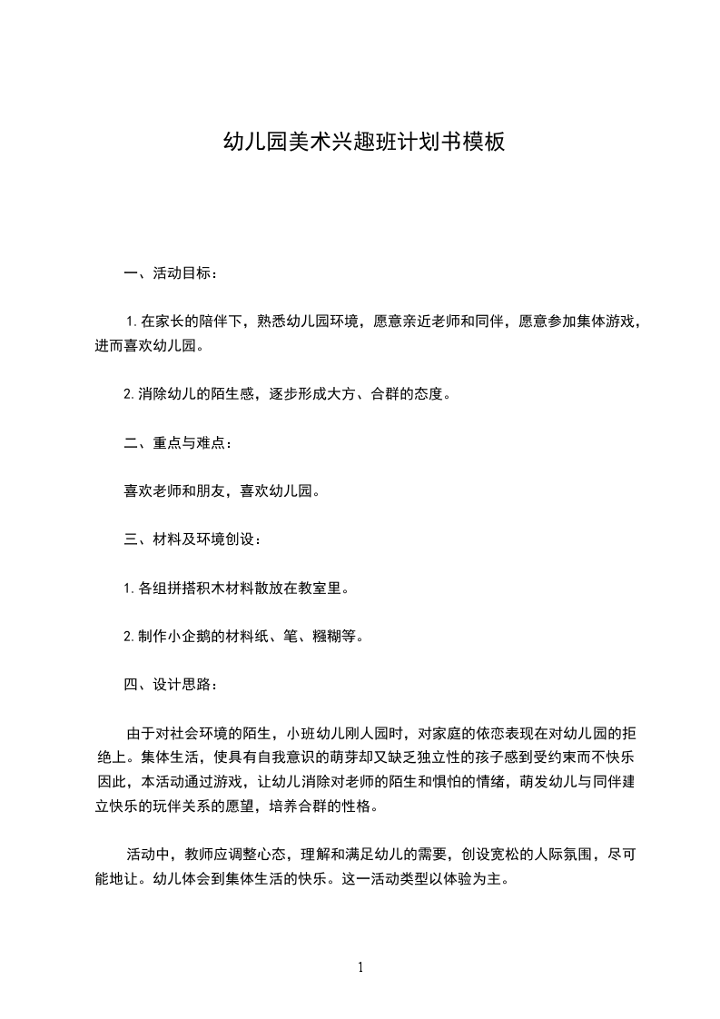.与个别幼儿交谈,消除陌生感。二看小朋友表演节目三和爸爸妈妈玩老师准备一些圆形纸,幼儿在爸爸妈妈的指导动手做企鹅宝宝。20幼儿园美术兴趣班方案书二