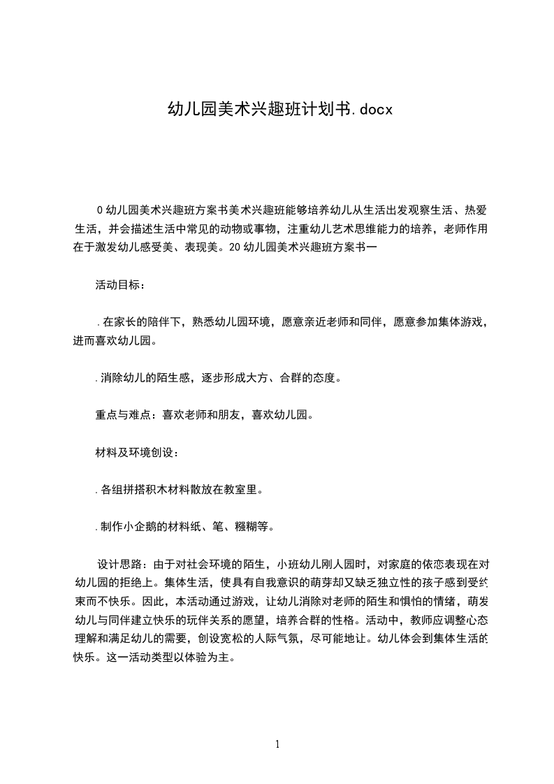 0幼儿园美术兴趣班方案书美术兴趣班能够培养幼儿从生活出发观察生活、热爱生活,并会描述生活中常见的动物或事物,注重幼儿艺术思维能力的培养,老师作用在于激发幼儿感受美、表现美。20幼儿园美术兴趣班方案书一