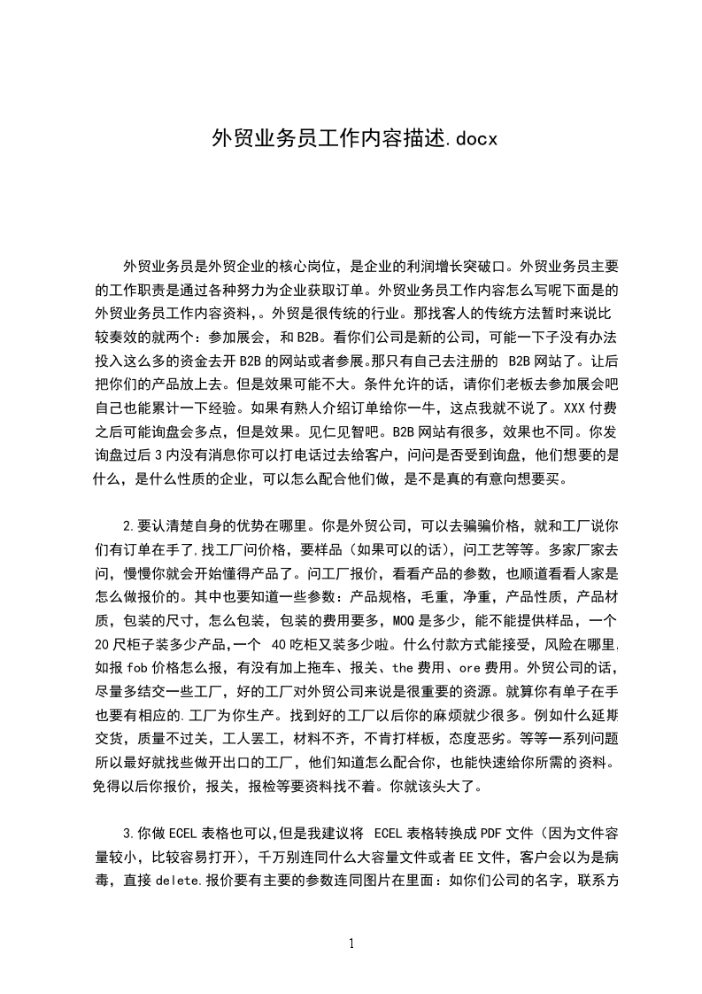 外贸业务员是外贸企业的核心岗位,是企业的利润增长突破口。外贸业务员主要的工作职责是通过各种努力为企业获取订单。外贸业务员工作内容怎么写呢下面是的外贸业务员工作内容资料,。外贸是很传统的行业。那找客人的传统方法暂时来说比较奏效的就两个:参加展会,和B2B。看你们公司是新的公司,可能一下子没有办法投入这么多的资金去开B2B的网站或者参展。那只有自己去注册的B2B网站了。让后把你们的产品放上去。但是效果可能不大。条件允许的话,请你们老板去参加展会吧,自己也能累计一下经验。如果有熟人介绍订单给你一牛,这点我就不说了。XXX付费之后可能询盘会多点,但是效果。见仁见智吧。B2B网站有很多,效果也不同。你发询盘过后3内没有消息你可以打电话过去给客户,问问是否受到询盘,他们想要的是什么,是什么性质的企业,可以怎么配合他们做,是不是真的有意向想要买。