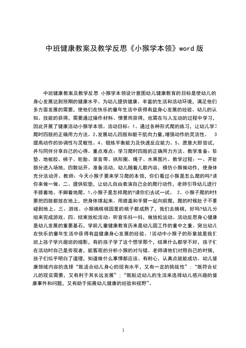 中班健康课教案及说课稿小猴学本领设计意图:幼儿健康教育的目标是使幼儿的身心发展达到预期的健康水平。为幼儿提供健康、丰富的生活和活动环境,满足他们多方面发展的需要,使他们在快乐的童年生活中获得有益于身心发展的经验。幼儿的认知、技能的获得,需要通过操作材料、情景而获得,也需在与人互动的过程中学习,因此开展了健康活动小猴学本领。活动目标:
