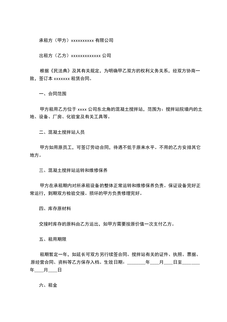 租期暂定一年,如延长可双方另行续签合同。搅拌站有关的证件、执照、票据、原经营合同、资料等乙方保存入档。生效日期:________年____月____日至________年____月____日