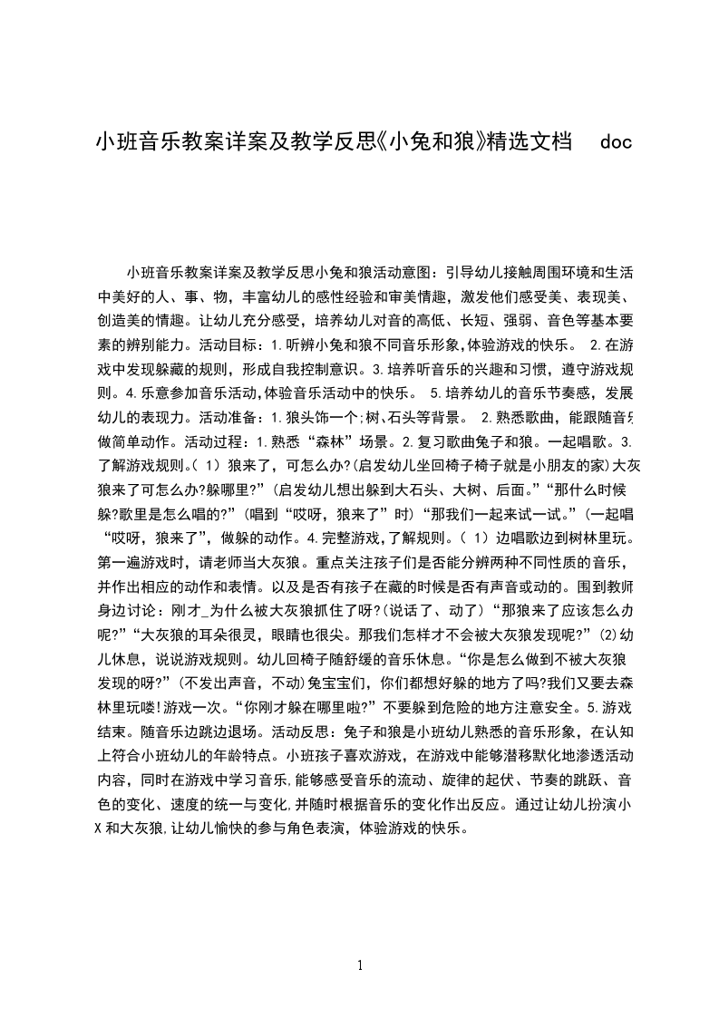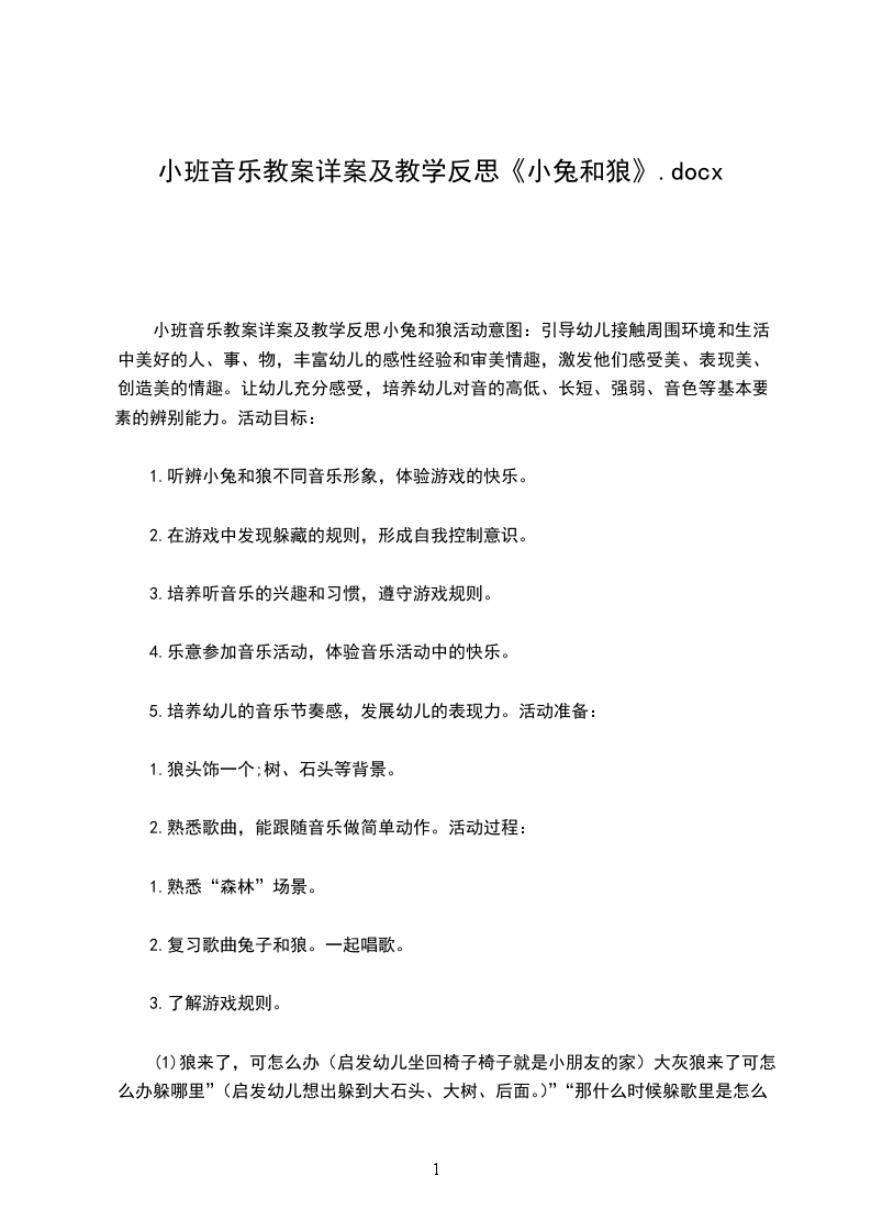 小班音乐教案详案及教学反思小兔和狼活动意图:引导幼儿接触周围环境和生活中美好的人、事、物,丰富幼儿的感性经验和审美情趣,激发他们感受美、表现美、创造美的情趣。让幼儿充分感受,培养幼儿对音的高低、长短、强弱、音色等基本要素的辨别能力。活动目标: