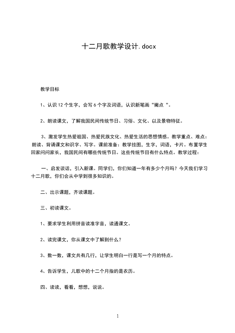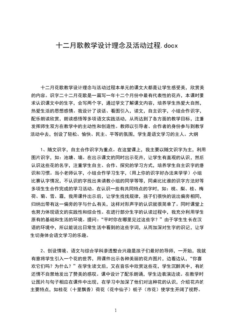 十二月花歌教学设计理念与活动过程本单元的课文大都是让学生感受美,欣赏美的内容。识字二十二月花歌是一篇写一年十二个月份中最有代表性的花卉,本课时要求认识课文中的生字,会写两个字,通过学文了解课文内容,培养学生热爱大自然,热爱生活的思想感情。我设计了谈话、看图引入,读文,自主识字,小组合作识字,配乐朗读欣赏,朗读感悟等多项语文实践活动,从而达到了各方面的教学目标,注重发挥师生双方在教学中的主动性和创造性。教师以引导者、合作者的身份参与到教学活动中去,创设了轻松、愉快、民主、平等的氛围,学生是语文学习的主人。大纲