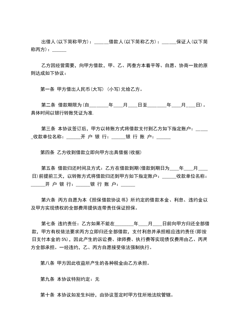 五、借款方式:签订本合同后,乙方应在_日之内将借款放出,转入甲方提供的银行账户。甲方银行账户为:,开户银行为,开户人为。