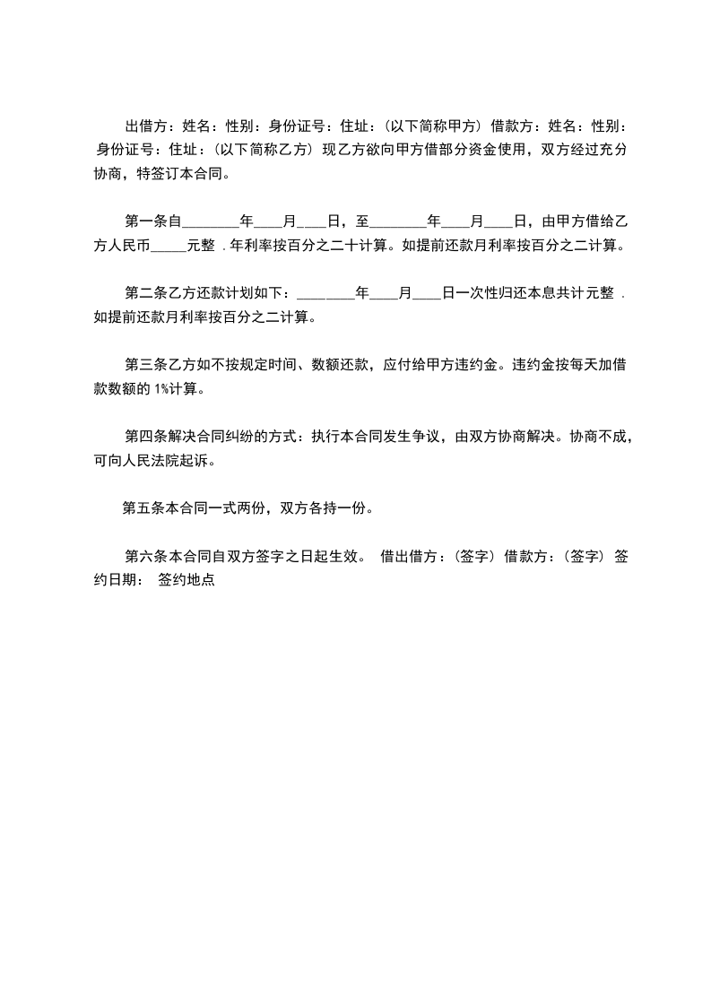 甲方(借款人):身份证号:乙方(贷款人):身份证号:为明确责任,恪守信用,在双方自愿、平等协商情况下,特订立本合同,以期共同遵守。