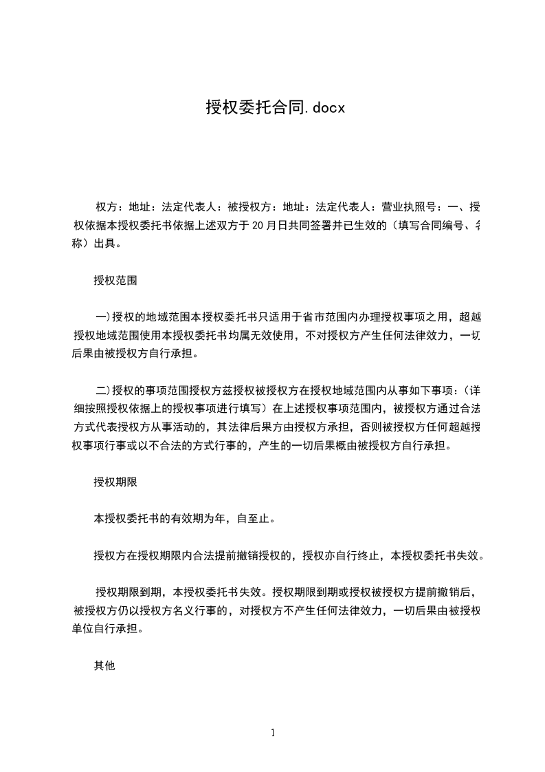 权方:地址:法定代表人:被授权方:地址:法定代表人:营业执照号:一、授权依据本授权委托书依据上述双方于20月日共同签署并已生效的(填写合同编号、名称)出具。