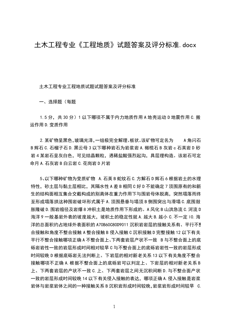 土木工程专业工程地质试题试题答案及评分标准