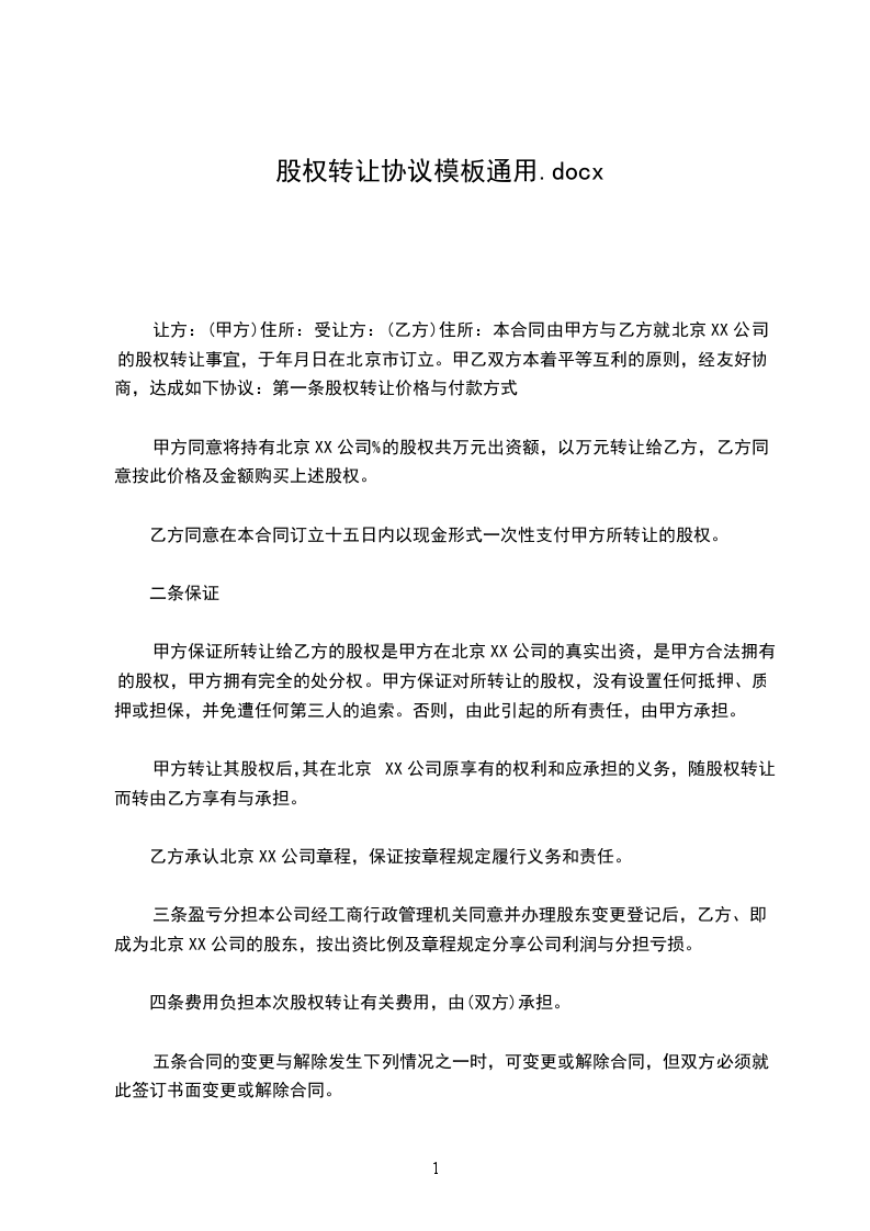让方:(甲方)住所:受让方:(乙方)住所:本合同由甲方与乙方就北京XX公司的股权转让事宜,于年月日在北京市订立。甲乙双方本着平等互利的原则,经友好协商,达成如下协议:第一条股权转让价格与付款方式