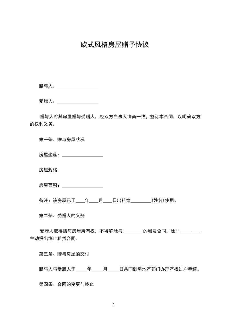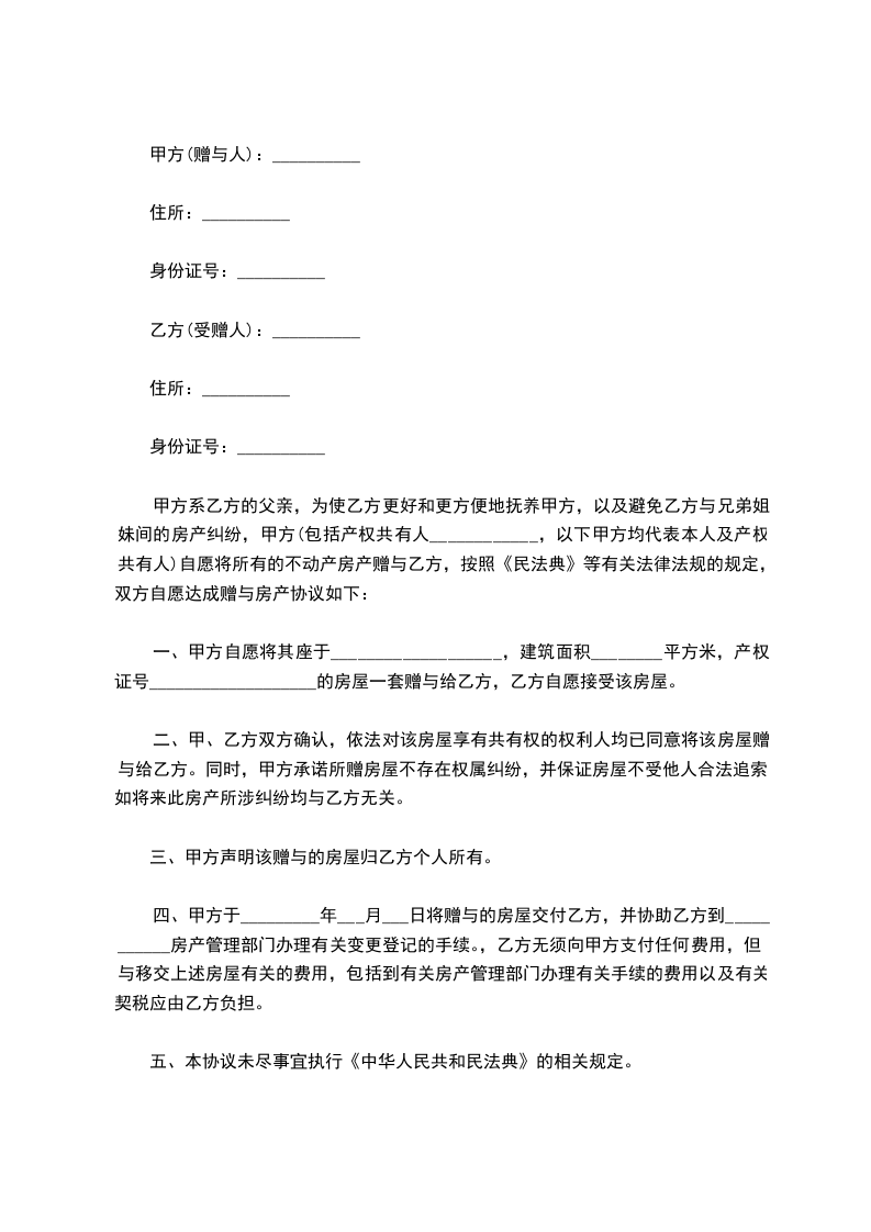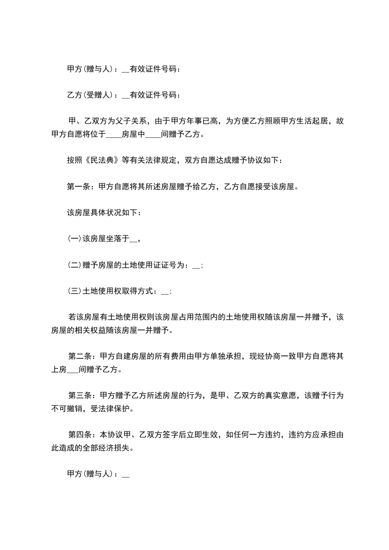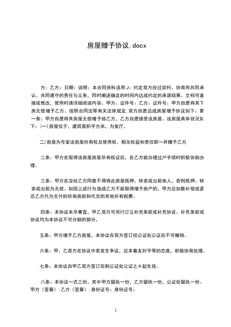 方:乙方:日期:说明:本合同资料适用J:约定双方经过谈判、协商而共同承认、共同遵守的责任与义务,同时阐述确定的时间内达成约定的承诺结果。文档可直接或修改,使用时请详细阅读内容。甲方:证件号:乙方:证件号:甲方自愿将其下房无偿增予乙方。按照合同法等有关法律规定,双方自愿达成房屋增予协议如下:第一条:甲方自愿将其房屋无偿增予给乙方,乙方自愿接受该房屋。该房屋具体状况如下:(一)房屋位于,建筑面积平方米,为室厅。