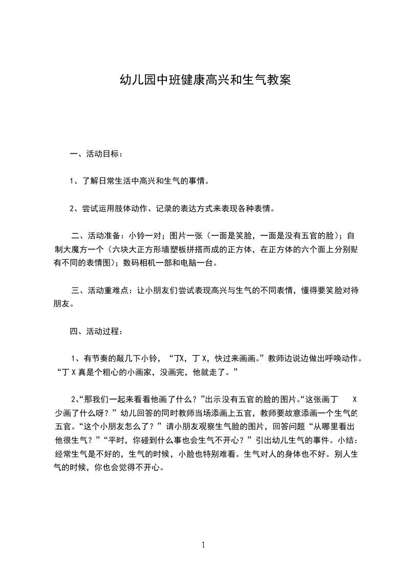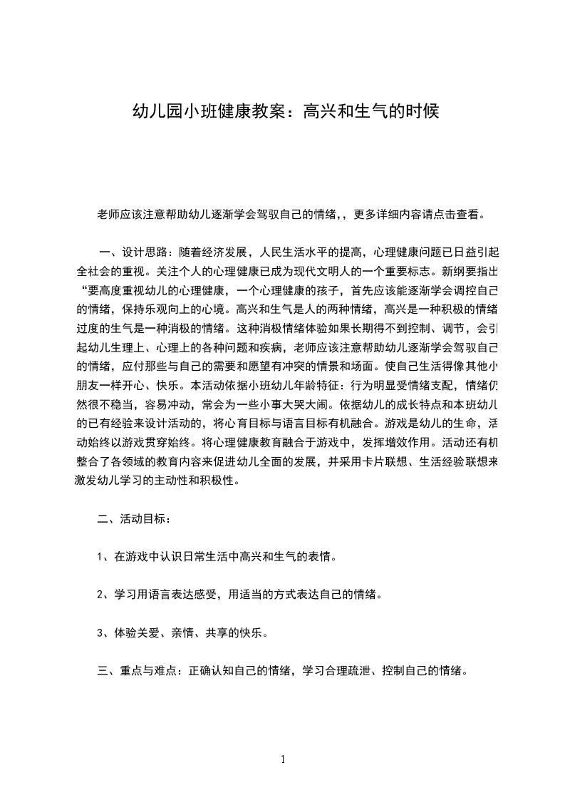 (4)或者轻轻的哭一哭、睡一觉、看看书、听听音乐、做做游戏等等,这样很快就没事了。教师小结:原来每个人都会有高兴的时候、生气的时候,当你高兴的时候,应该让大家分享。当你生气的时候也不要发脾气,大家都会来帮助你解决困难的。生气并不是一件坏事情,如果生气时伤害了自己,防碍了别人,就是件坏事情,如果经常生气是一种不好的行为。