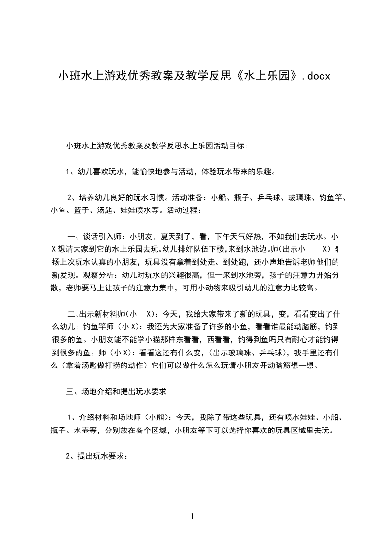 一、谈话引入师:小朋友,夏天到了,看,下午天气好热,不如我们去玩水。小X想请大家到它的水上乐园去玩。幼儿排好队伍下楼,来到水池边。师(出示小X)表扬上次玩水认真的小朋友,玩具没有拿着到处走、到处跑,还小声地告诉老师他们的新发现。观察分析:幼儿对玩水的兴趣很高,但一来到水池旁,孩子的注意力开始分散,老师要马上让孩子的注意力集中,可用小动物来吸引幼儿的注意力比较高。