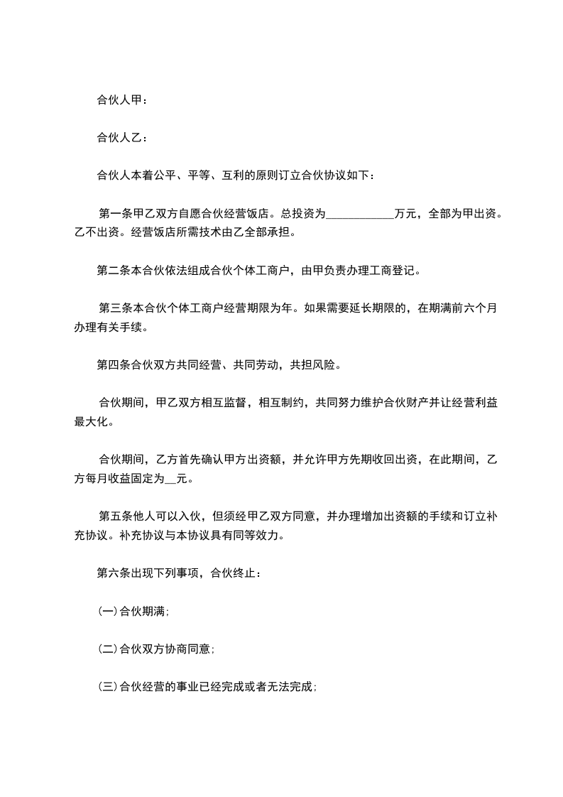 第一条甲乙双方自愿合伙经营饭店。总投资为____________万元,全部为甲出资。乙不出资。经营饭店所需技术由乙全部承担。