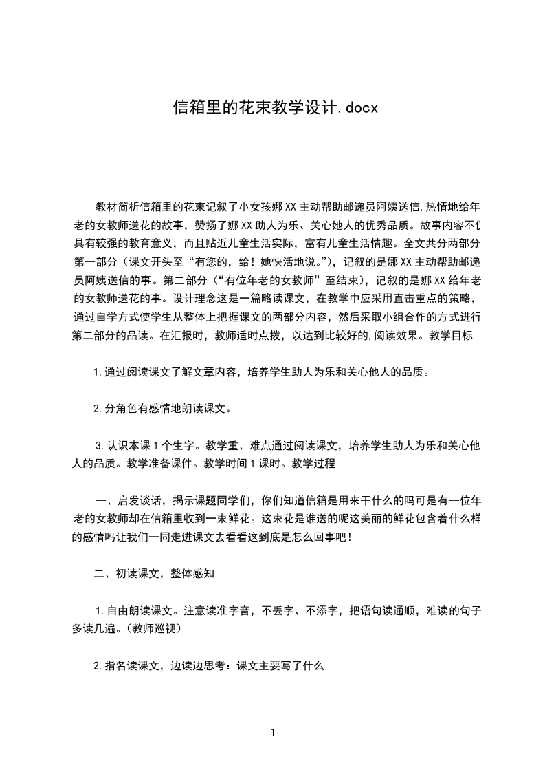 教材简析信箱里的花束记叙了小女孩娜XX主动帮助邮递员阿姨送信,热情地给年老的女教师送花的故事,赞扬了娜XX助人为乐、关心她人的优秀品质。故事内容不仅具有较强的教育意义,而且贴近儿童生活实际,富有儿童生活情趣。全文共分两部分。第一部分(课文开头至“有您的,给!她快活地说。”),记叙的是娜XX主动帮助邮递员阿姨送信的事。第二部分(“有位年老的女教师”至结束),记叙的是娜XX给年老的女教师送花的事。设计理念这是一篇略读课文,在教学中应采用直击重点的策略,通过自学方式使学生从整体上把握课文的两部分内容,然后采取小组合作的方式进行第二部分的品读。在汇报时,教师适时点拨,以达到比较好的,阅读效果。教学目标