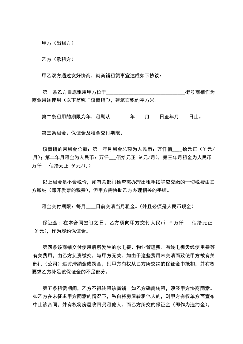 第一条乙方自愿租用甲方位于________________________________街号商铺作为商业用途使用(以下简称“该商铺”),建筑面积约平方米.