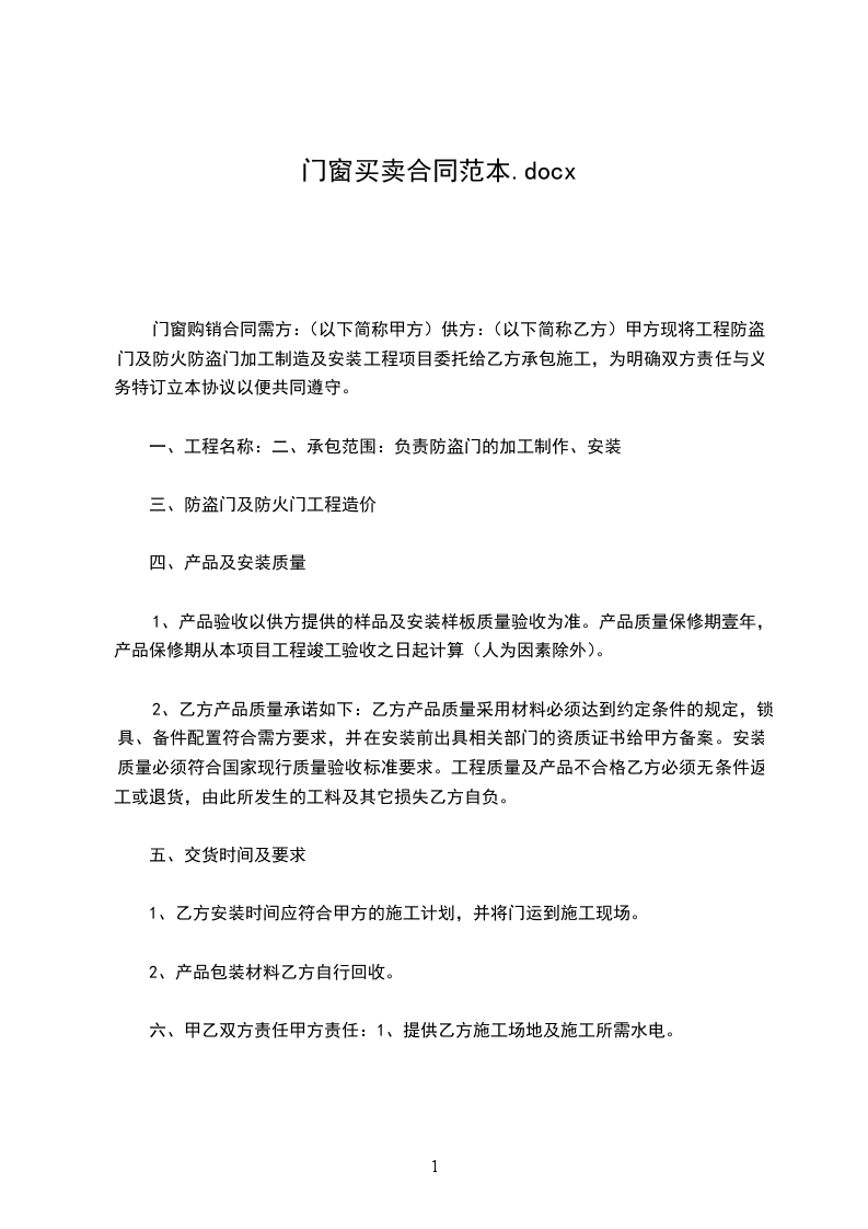 门窗购销合同需方:(以下简称甲方)供方:(以下简称乙方)甲方现将工程防盗门及防火防盗门加工制造及安装工程项目委托给乙方承包施工,为明确双方责任与义务特订立本协议以便共同遵守。