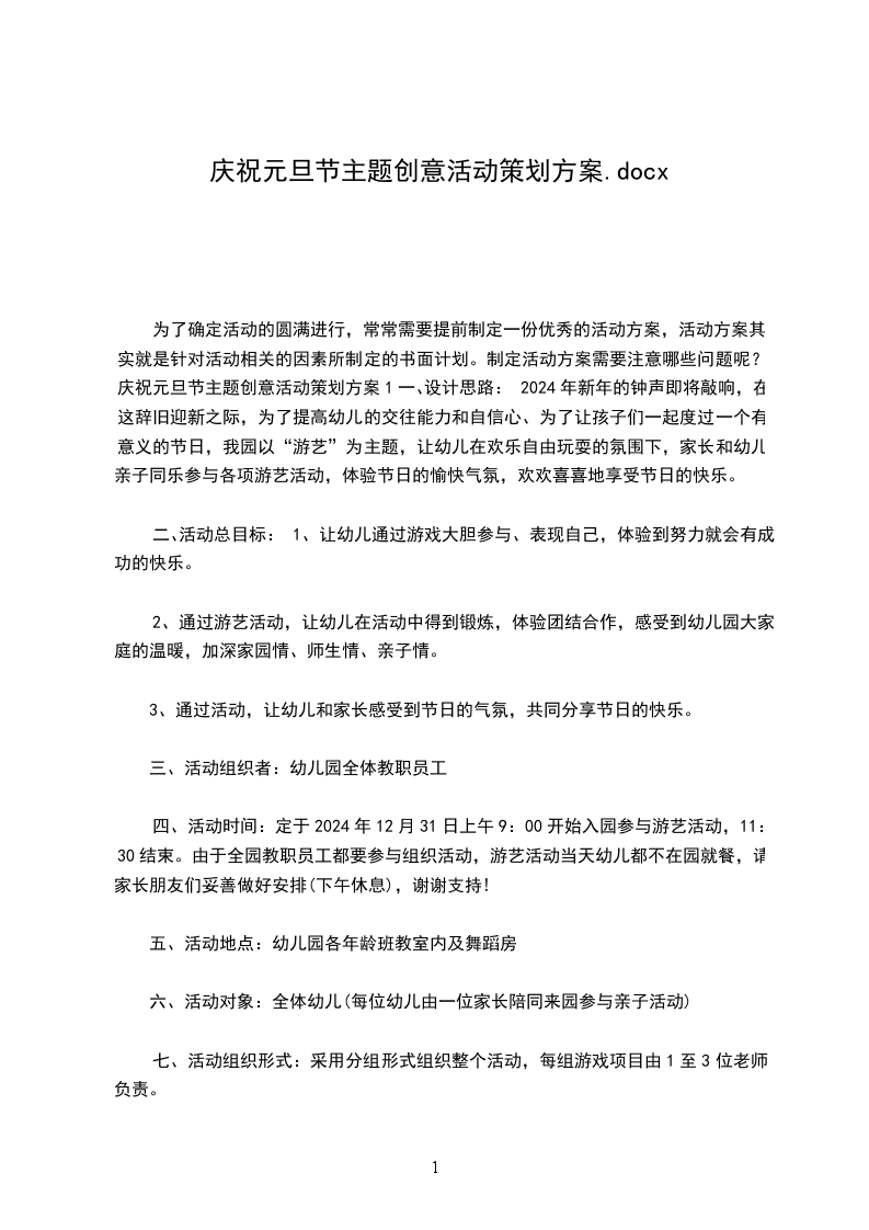 为了确定活动的圆满进行,常常需要提前制定一份优秀的活动方案,活动方案其实就是针对活动相关的因素所制定的书面计划。制定活动方案需要注意哪些问题呢?庆祝元旦节主题创意活动策划方案1一、设计思路:2024年新年的钟声即将敲响,在这辞旧迎新之际,为了提高幼儿的交往能力和自信心、为了让孩子们一起度过一个有意义的节日,我园以“游艺”为主题,让幼儿在欢乐自由玩耍的氛围下,家长和幼儿亲子同乐参与各项游艺活动,体验节日的愉快气氛,欢欢喜喜地享受节日的快乐。
