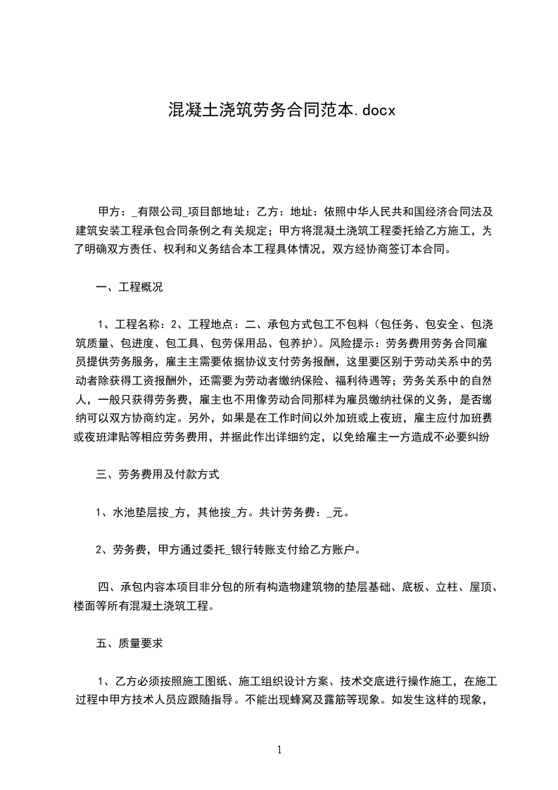 1、工程名称:2、工程地点:二、承包方式包工不包料(包任务、包安全、包浇筑质量、包进度、包工具、包劳保用品、包养护)。风险提示:劳务费用劳务合同雇员提供劳务服务,雇主主需要依据协议支付劳务报酬,这里要区别于劳动关系中的劳动者除获得工资报酬外,还需要为劳动者缴纳保险、福利待遇等;劳务关系中的自然人,一般只获得劳务费,雇主也不用像劳动合同那样为雇员缴纳社保的义务,是否缴纳可以双方协商约定。另外,如果是在工作时间以外加班或上夜班,雇主应付加班费或夜班津贴等相应劳务费用,并据此作出详细约定,以免给雇主一方造成不必要纠纷。