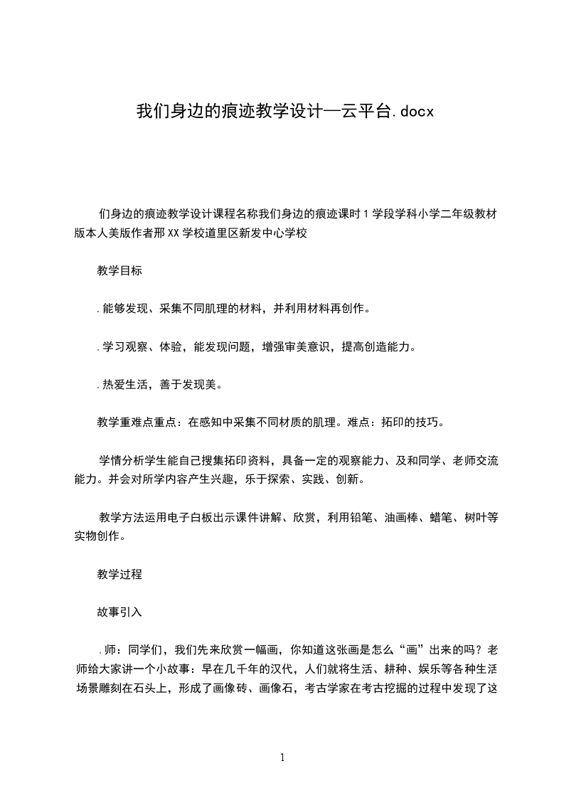 们身边的痕迹教学设计课程名称我们身边的痕迹课时1学段学科小学二年级教材版本人美版作者邢XX学校道里区新发中心学校