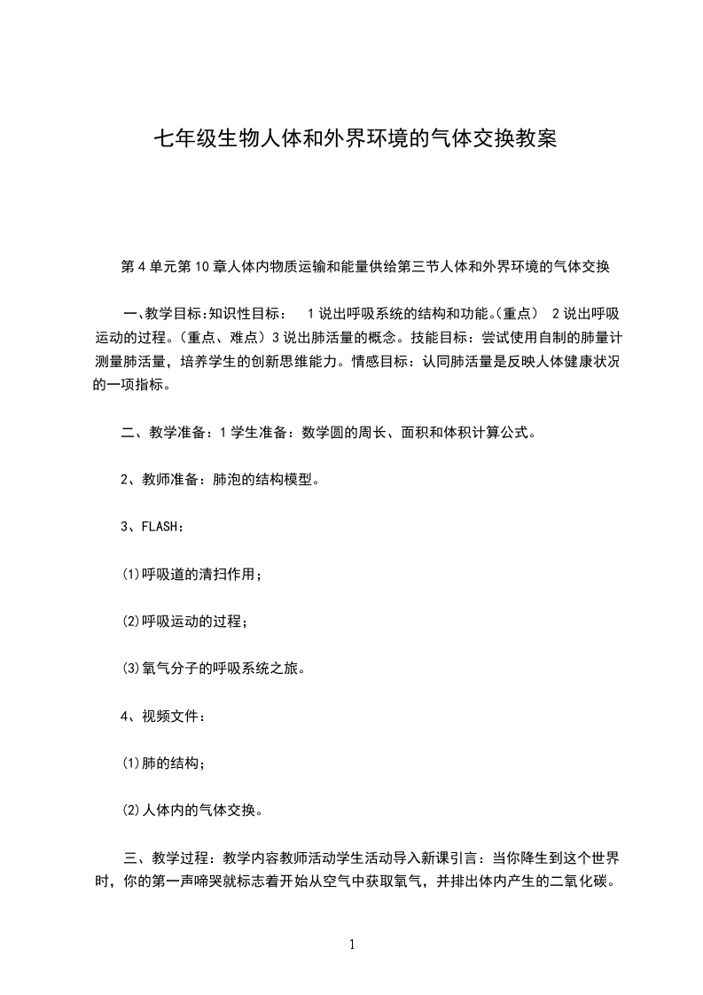 2.能力目标通过观看呼吸系统的图形与视频资料,提高学生的利用图形视频等资料处理信息的能力;通过观察模型和演示,提高学生的观察、判断、推理及科学实验能力3情感、态度与价值观目标初步形成“器官的形态结构与功能相适应”的生物学观点。通过小组制作模型,各尽其能,充分享受合作中的愉快。关注自身呼吸系统健康,养成良好的生活习惯教材分析及教学设计说明:本节内容是在系统学习了食物的营养成分、食物中的营养成分的消化和吸收以及合理膳食、食品安全等知识之后,所要学习的与人体新陈代谢直接相关的另一部分内容。第一节人体与外界的气体交换包括“呼吸系统的组成”、“肺泡与外界有气体交换”、“人体内的气体交换”三部分内容。这部分呼吸系统的组成部分比较抽象,学生不好理解。张XX的教学设计适用性强,较好地激发了学生的学习兴趣和参与热情。好的开始是成功的一半,开始通过小游戏创设情境,让学生亲自体验:我们的生活离不开空气,激发学习兴趣,调动学习的积极性。教学过程的设计,注重学生的主动参与,充分发挥学生的主体作用。特别是让学生亲自用注射器体验容积与气压的关系,以其直观形象,有效的化解了抽象,突破了难点。最好精选了三类达标题,让学生趁热打铁,巩固自己所学知识,达到预期效果。这是一节成功的教学设计。我在张XX的基础上进行了调整,希望这节课更加完善。第一,增加复习提问这一环节,通过提问植物的呼吸作用,让学生既回顾了上学期的内容,又自然导出了本节课题;第二,学生自己总结呼吸系统的组成,印象深刻,效果更好;第三,介绍肺泡适于气体交换的特点,多媒体投影肺泡结构示意图,此图更形象地展示了肺泡适于气体交换的特点,能帮助学生更好的理解;第四,在演示膈肌收缩和舒张的实验时,把向下拉橡皮膜改为向上推橡皮膜,这样与实际膈肌的移动方向一致,学生更容易理解;第五,板书过于简单,增加了板书内容。课前准备:教师准备: