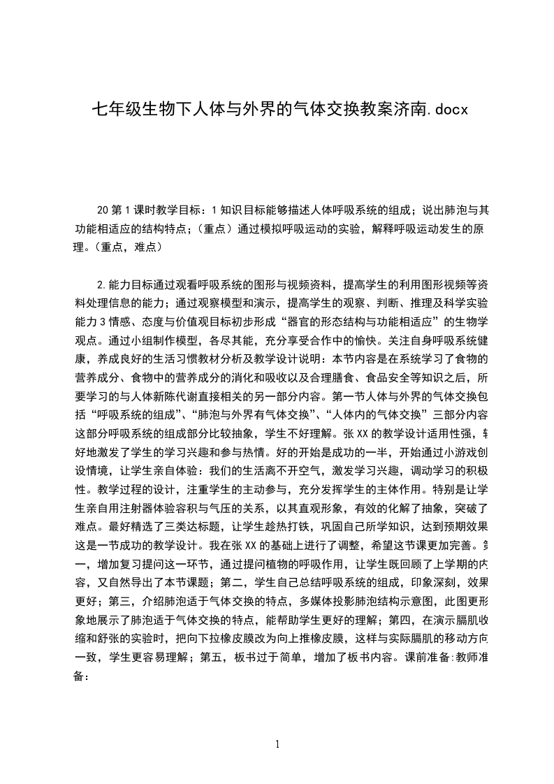 (4)请说明在AB段、BC段中,呼吸肌的收缩和舒张情况:AB段,呼吸肌;BC段,呼吸肌O4/WIWC类我是小法官“我是小法一对夫妇被指控用水溺死了女婴,但是这对夫官”的题妇坚决否认,宣称女婴生下来就是死的。于是法目,增加了医立即解剖了死婴,取出肺将其放在水中,法官生物的趣味在看到肺沉入水底后,当庭宣判这对夫妇无罪释性,同时渗放。那么法官做出这样的判决的依据是什么法学生讨论透生活中的庭内旁听的观众很不理解这个判决。我们在座的问题可以用小生物学家们能否向这些观众说明一下“沉肺断专业的知识案”的理由教师点拨:婴儿在出生前不用肺呼吸,所以,肺内是没有空气的。出生后,肺内才进入空气。来解决,学好生物很重要!板书设计第一节人体与外界的气体交换、呼吸系统的组成f鼻腔)气体进出肺的通道,清洁、温暖、湿润空气呼吸肌收缩和舒张胸廓有节律的扩大和缩小肺被动的扩张和回缩肺内气压下降和升高气体进出肺泡吸气和呼气肺气体交换的主要场所、肺泡与,外界的气体交换,吸气动作呼吸运动,过程呼气动作教学反思:张XX的教学设计适用性强,较好地激发了学生的学习兴趣和参与热情。好的开始是成功的一半,开始通过小游戏创设情境,让学生亲自体验:我们的生活离不开空气,激发学习兴趣,调动学习的积极性。教学过程的设计,注重学生的主动参与,充分发挥学生的主体作用。特别是让学生亲自用注射器体验容积与气压的关系,以其直观形象,有效的化解了抽象,突破了难点。最好精选了三类达标题,让学生趁热打铁,巩固自己所学知识,达到预期效果。这是一节成功的教学设计。我在张XX的基础上进行了调整,希望这节课更加完善。第一,增加复习提问这一环节,通过提问植物的呼吸作用,让学生既回顾了上学期的内容,又自然导出了本节课题;第二,学生自己总结呼吸系统的组成,印象深刻,效果更好;第三,介绍肺泡适于气体交换的特点,多媒体投影肺泡结构示意图,此图更形象地展示了肺泡适于气体交换的特点,能帮助学生更好的理解;第四,在演示膈肌收缩和舒张的实验时,把向下拉橡皮膜改为向上推橡皮膜,这样与实际膈肌的移动方向一致,学生更容易理解;第五,板书过于简单,增加了板书内容。