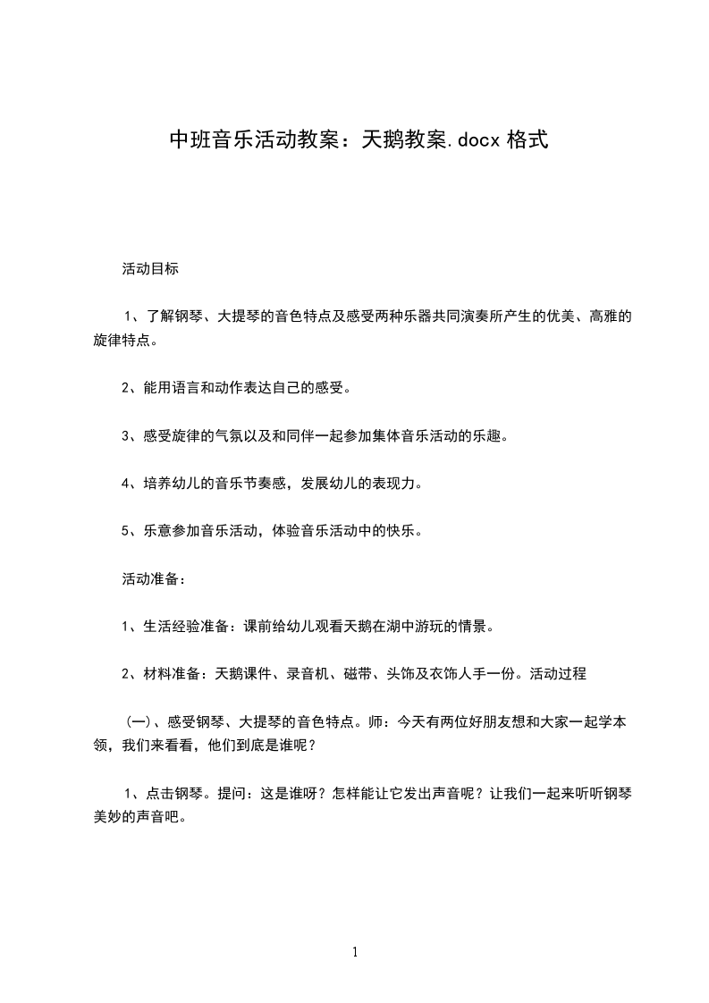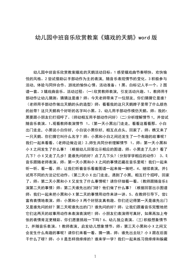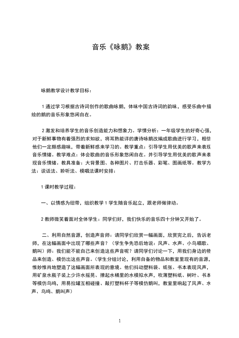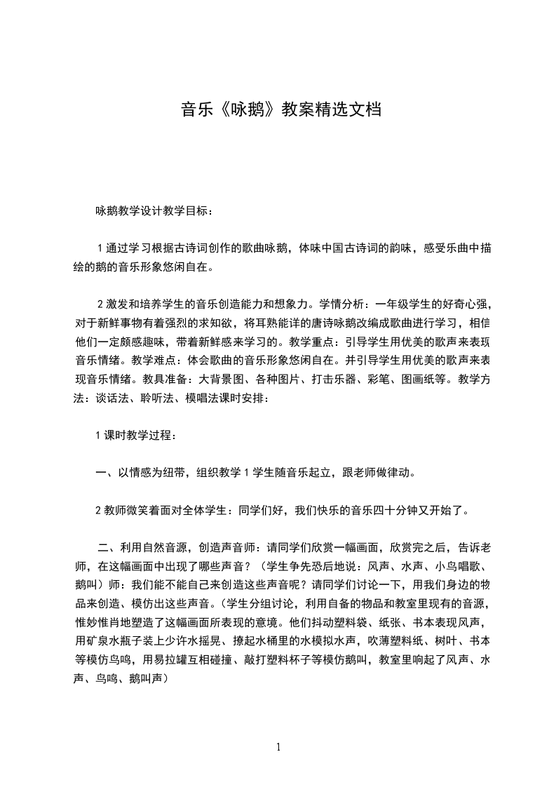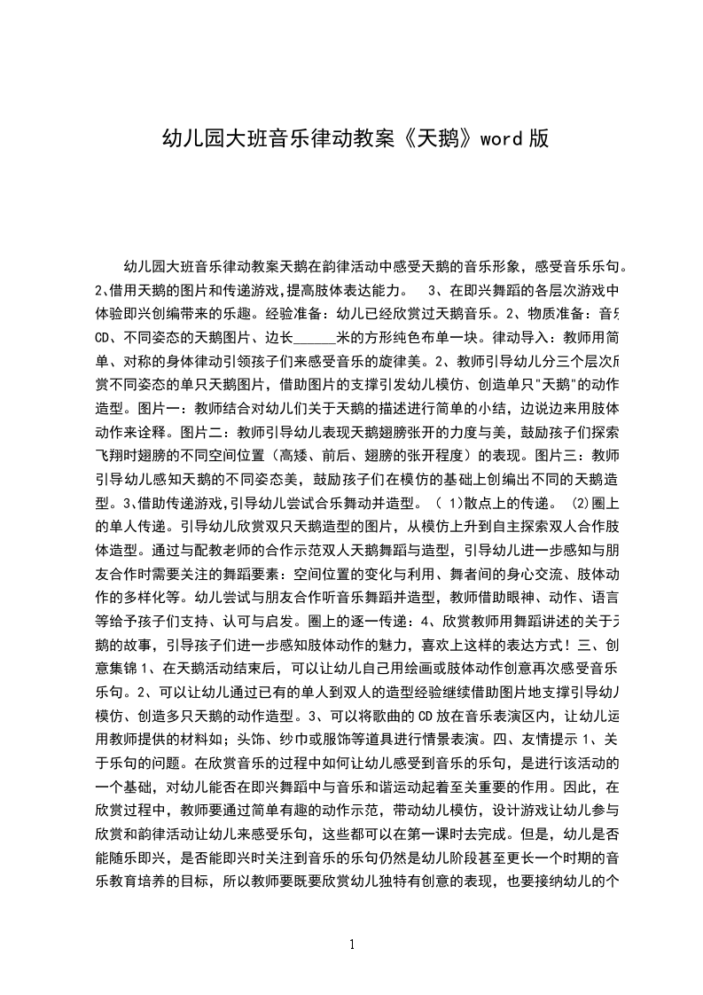 八、 课堂,结合音乐“飞“出教室。2教学目标:通过欣赏大提琴独奏曲天鹅,启发学生展开丰富地想象,鼓励学生创造自己的形体语言,结合音乐去表现天鹅,体会幽静、优美的意境。教学重难点:创造形体语言去表现对音乐的感受,表现音乐的意境。教学准备:电视机、VCD机、磁带、图片、水彩笔、头饰等。教学过程: