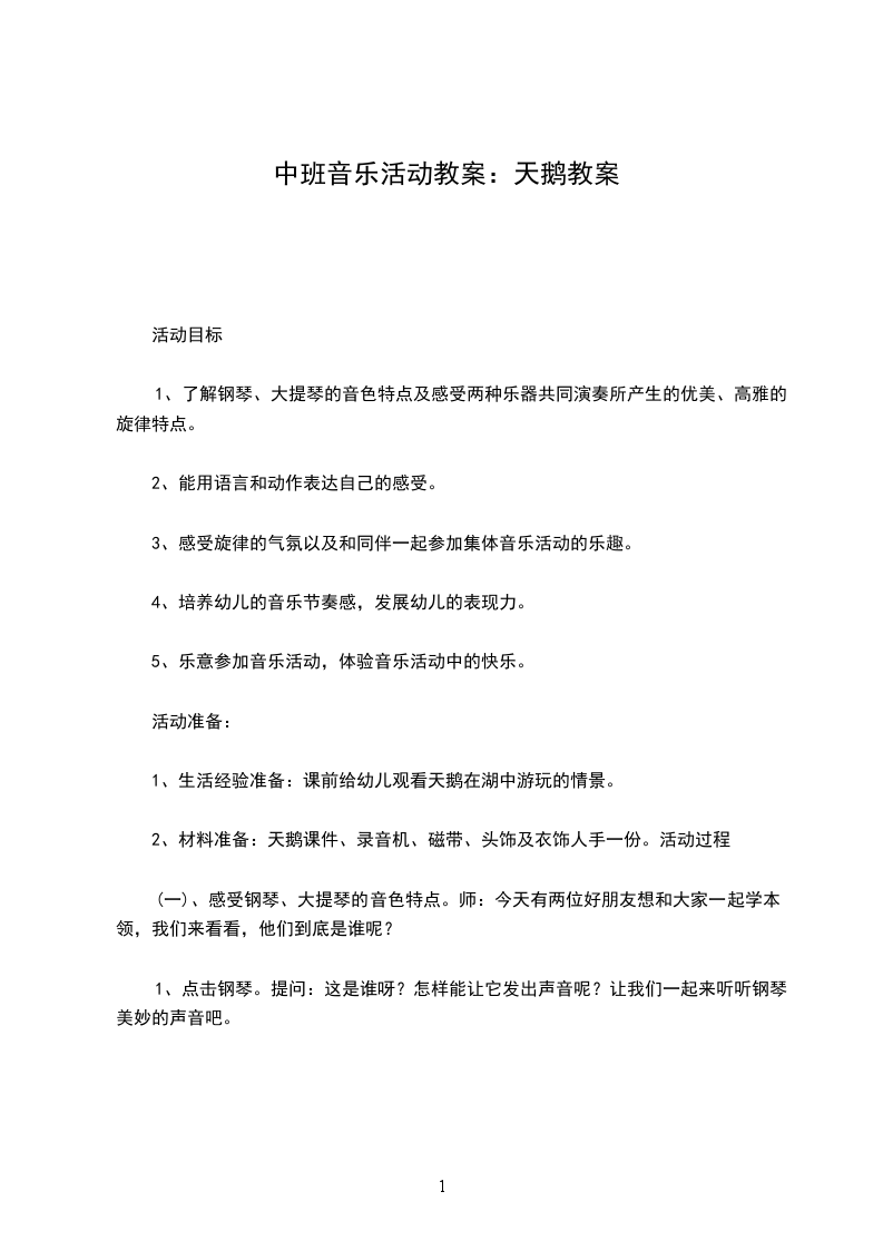 (五)复听刚才我们已经知道天鹅是由大提琴演奏的。那么你还记得除了大提琴还有什么乐器的声音吗?如果说大提琴表现了天鹅,那么钢琴又表现了什么呢?请让我们再仔细地听一遍,除了要仔细聆听大提琴演奏的音乐,还要注意钢琴的伴奏。