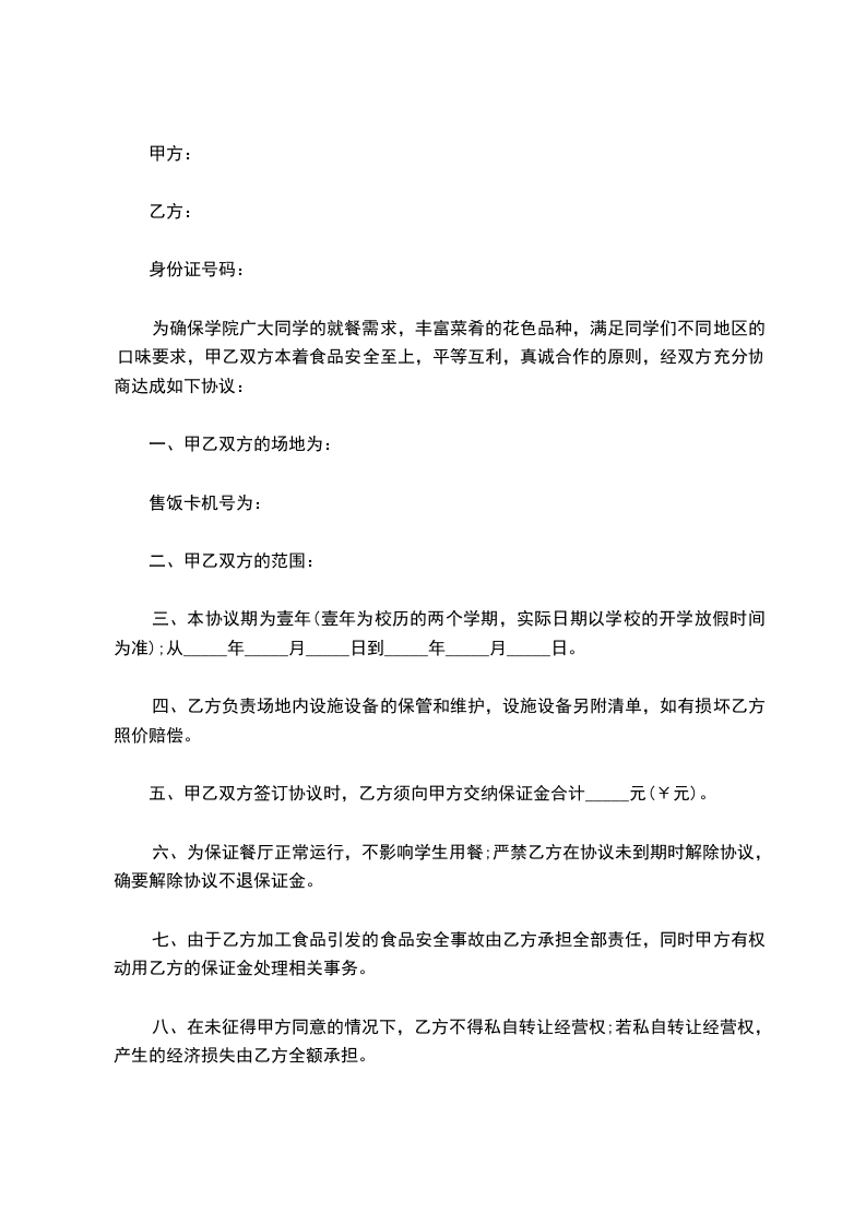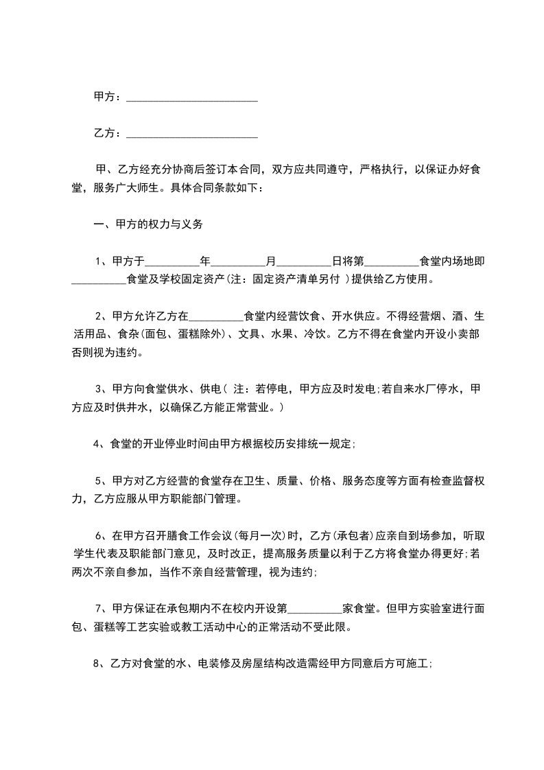 0、加强对工人的卫生教育,尽快形成良好的卫生习惯,上岗工人必须全部持有健康证,定期对工人进行体检,工作服统一整洁,持证上岗,杜绝传染病者进入食堂。11、认真管理使用好物品,摆放合理,保证操作间内干净卫生,整洁有序,无权把使用承包的公物包括餐厅借给别人使用。12、不断提高工人的综合素质,严格要求自己,规范着装,文明言行,团结协作,尊敬老师,爱护学生。本协议有效期为_年_月_日_年_月_日,_年_月_日起,该食堂全部资产无条件属于甲方所有。以上协议一式两份,甲乙双方各执一份,双方签字后,于_年_月_日起生效。甲方:_乙方:_