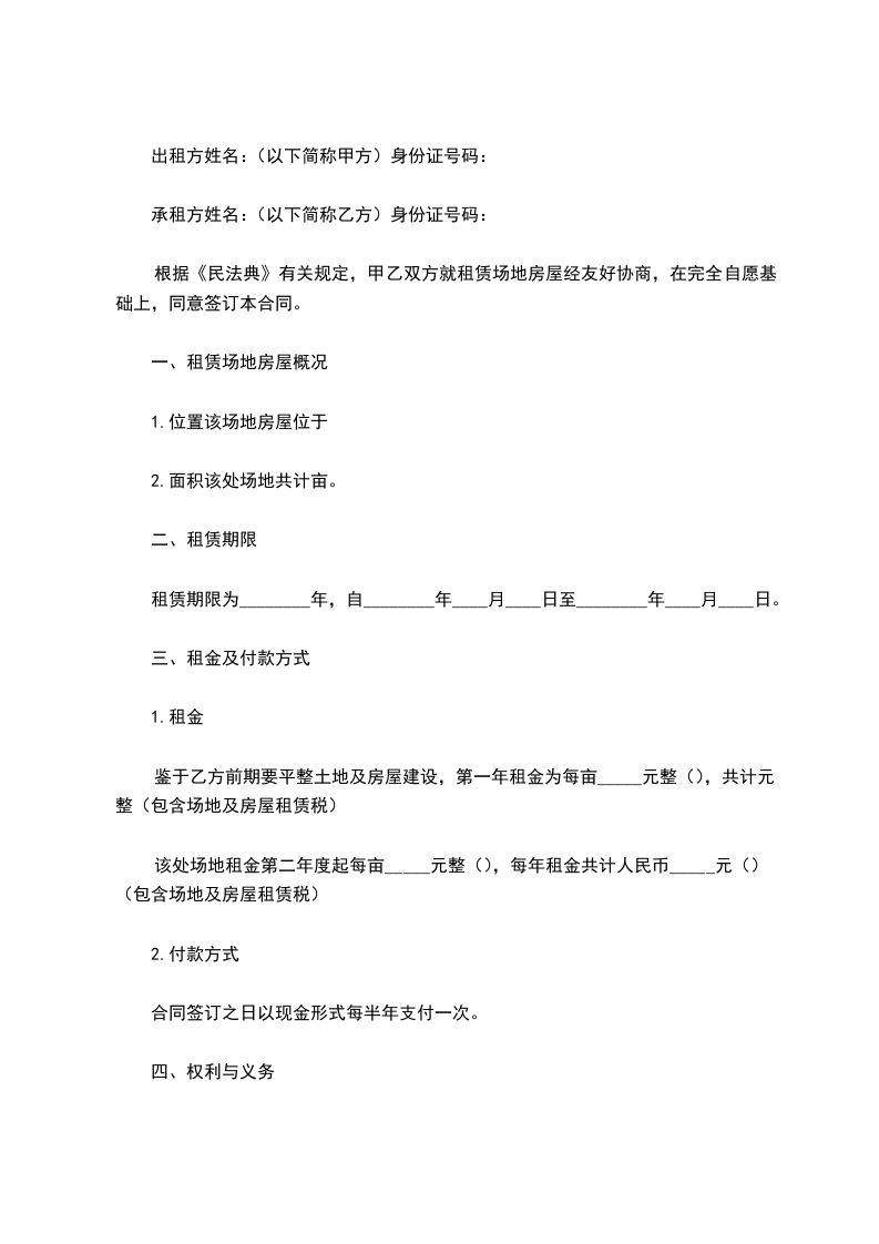 根据《民法典》有关规定,甲乙双方就租赁场地房屋经友好协商,在完全自愿基础上,同意签订本合同。