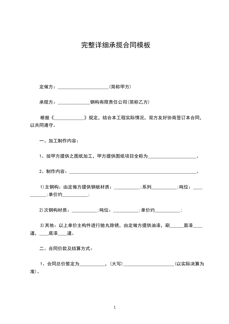 1)主钢构:由定做方提供钢板材质:___________;系列___________;吨位:___________;单价约___________;