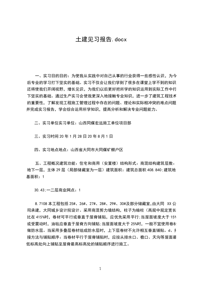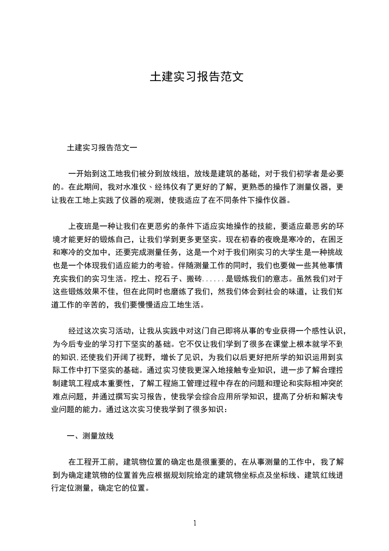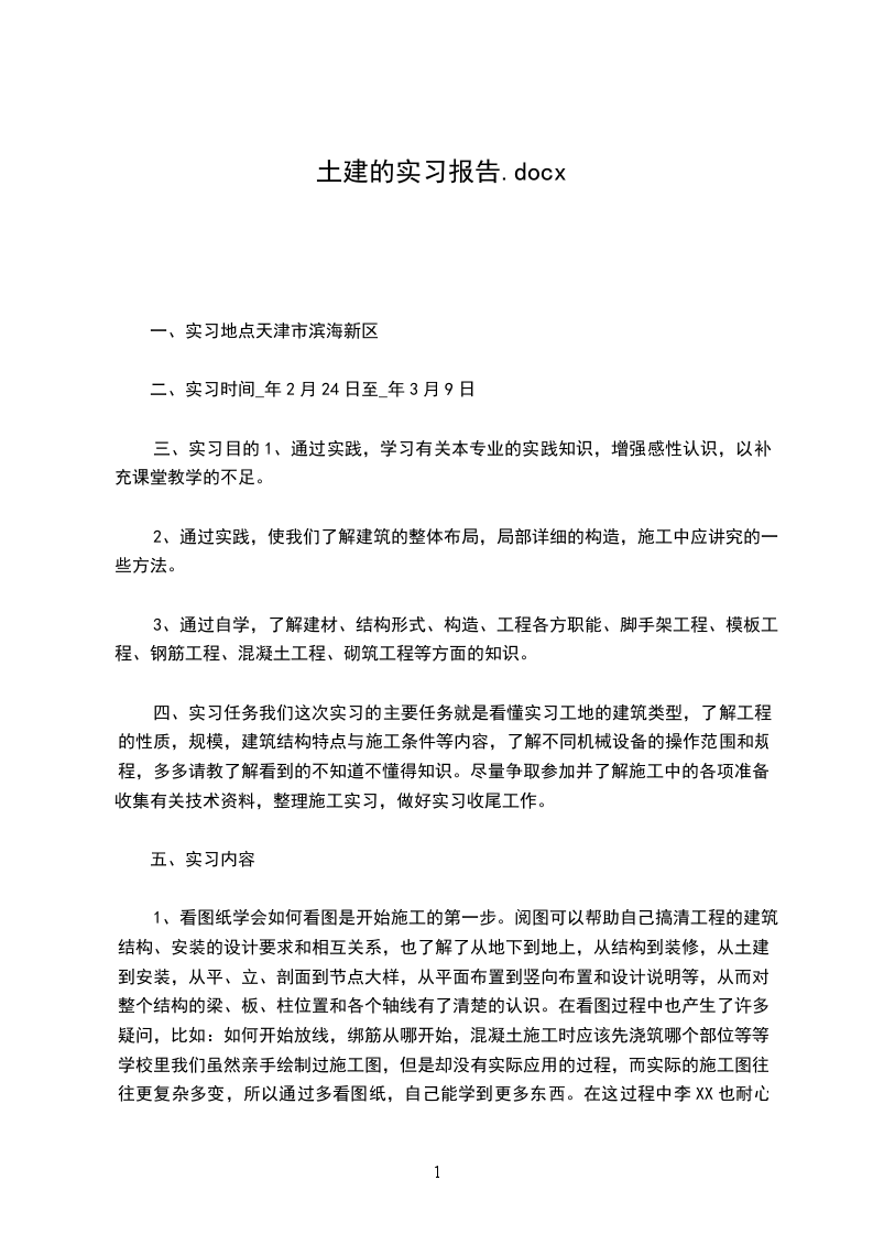 七、实习体会在一年的实习生活中,让我收获了很多而且通过这次实习使我对工程方面的有关知识在实际上有了更深一些的了解,应该说在学校学习再多的专业知识也只是理论上的,与实际还是有点差别的。这次实习对我的识图及作图能力都有一定的帮助,识图时知道哪些地方该注意、须细心计算。在结构上哪些地方须考虑施工时的安全问题,到即能施工又符合规范要求,达到设计、施工标准化。工地虽苦,但能学的是一些现实东西,锻炼的是解决问题的实践能力。实习结束后有必要好好总结一下。通过这次实习让我深刻体会到读书固然是增长知识开阔眼界的途径,但是多一些实践,畅徉于实事当中,触摸一下社会的脉搏,给自己定个位,也是一种绝好的提高自身综合素质的选择。更多实习相关文书请点击:实习报告