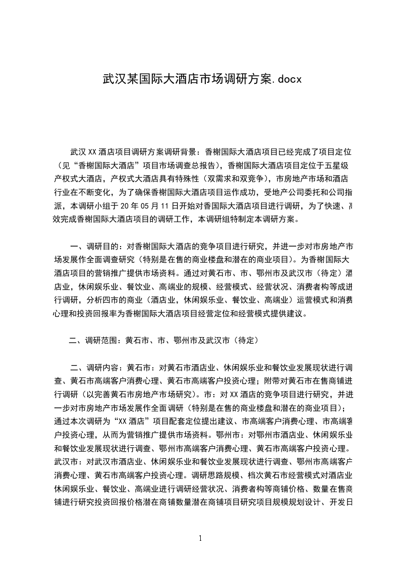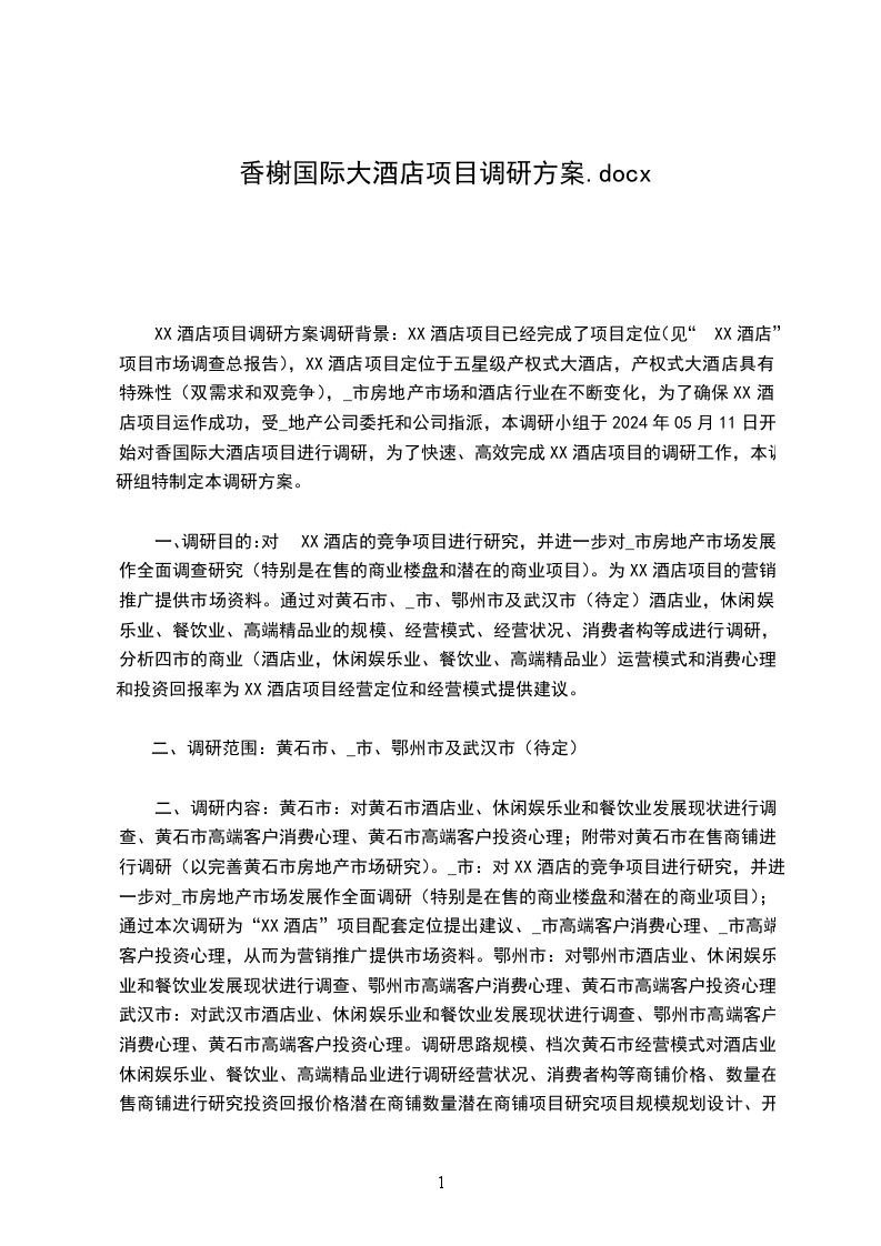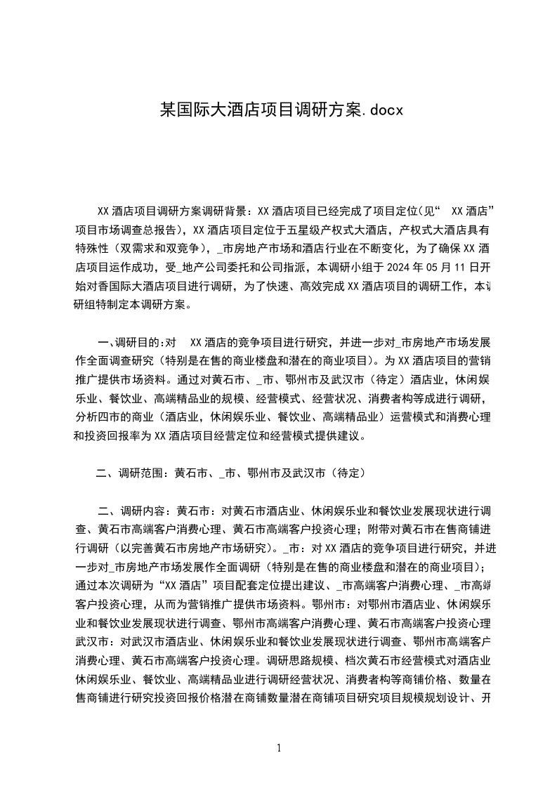 XX酒店项目调研方案调研背景:XX酒店项目已经完成了项目定位(见“XX酒店”项目市场调查总报告),XX酒店项目定位于五星级产权式大酒店,产权式大酒店具有特殊性(双需求和双竞争),_市房地产市场和酒店行业在不断变化,为了确保XX酒店项目运作成功,受_地产公司委托和公司指派,本调研小组于2024年05月11日开始对香国际大酒店项目进行调研,为了快速、高效完成XX酒店项目的调研工作,本调研组特制定本调研方案。