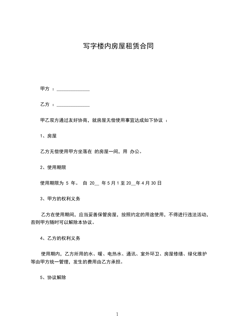 5.甲方不承担因乙方对工作用房进行装修拆改,或因不可抗力的原因导致毁损工作用房和造成乙方财产、人身安全等损失的责任。