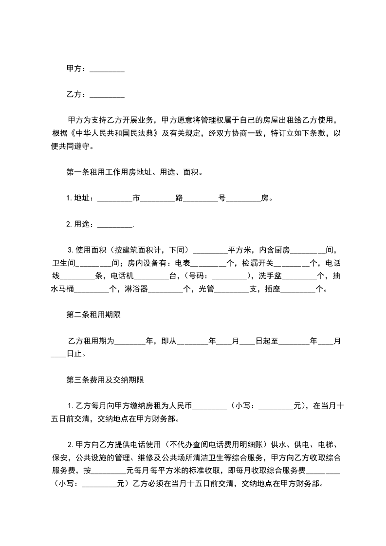 甲方为支持乙方开展业务,甲方愿意将管理权属于自己的房屋出租给乙方使用,根据《中华人民共和国民法典》及有关规定,经双方协商一致,特订立如下条款,以便共同遵守。