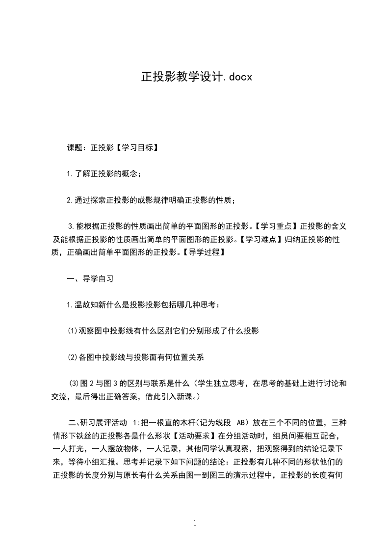 3.能根据正投影的性质画出简单的平面图形的正投影。【学习重点】正投影的含义及能根据正投影的性质画出简单的平面图形的正投影。【学习难点】归纳正投影的性质,正确画出简单平面图形的正投影。【导学过程】