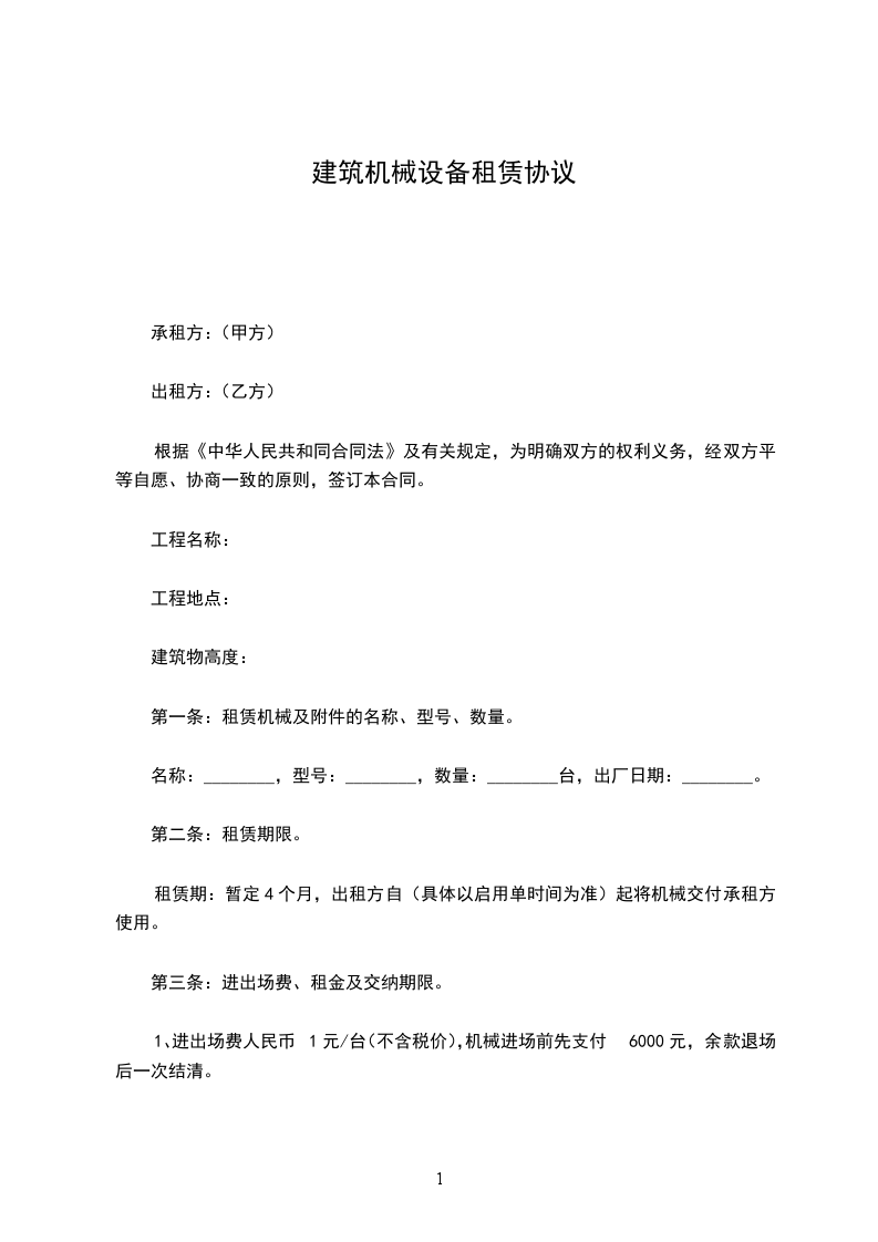1、进出场费人民币1元/台(不含税价),机械进场前先支付6000元,余款退场后一次结清。