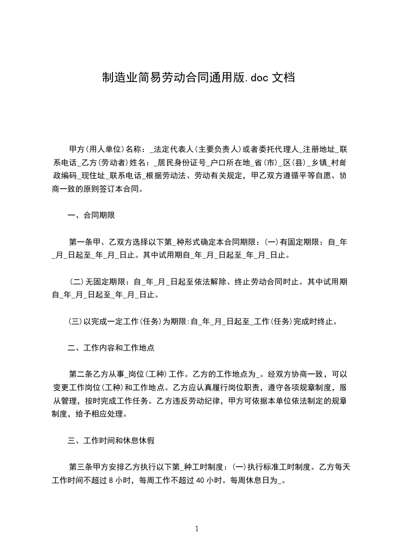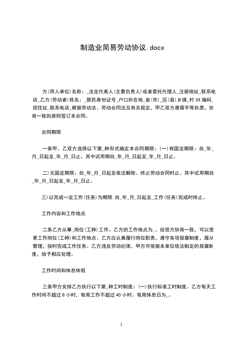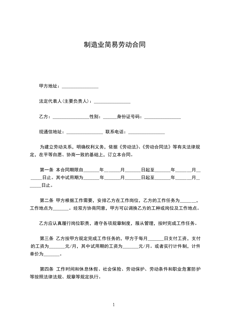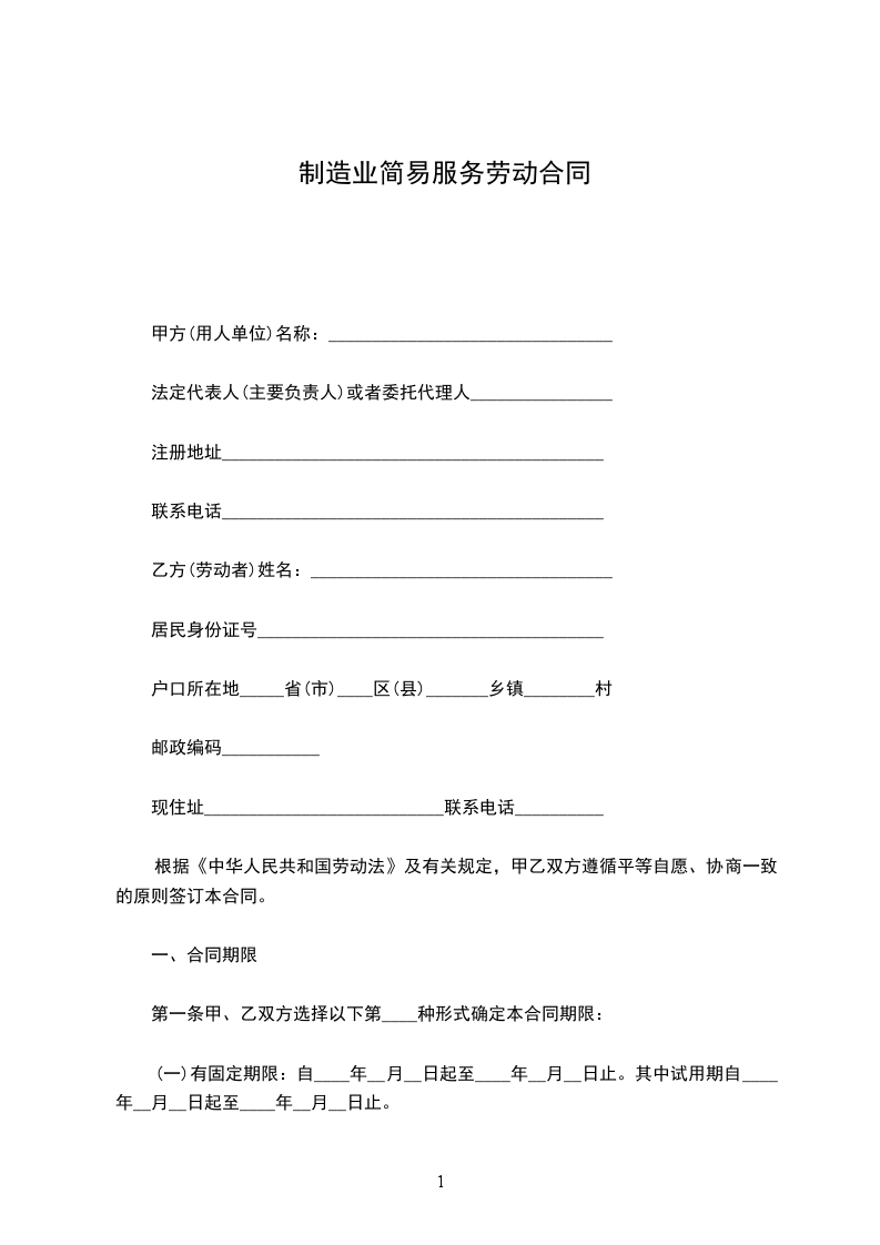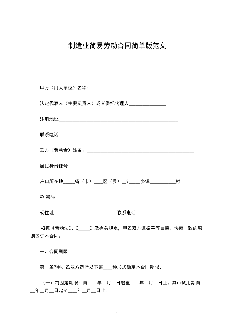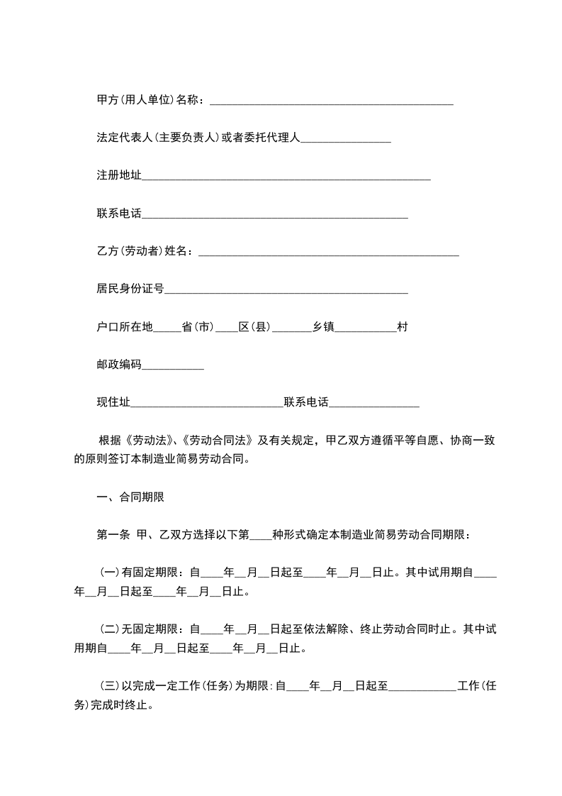 方(用人单位)名称:_法定代表人(主要负责人)或者委托代理人_注册地址_联系电话_乙方(劳动者)姓名:_居民身份证号_户口所在地_省(市)_区(县)乡镇_村XX编码_现住址_联系电话_根据劳动法、劳动合同法及有关规定,甲乙双方遵循平等自愿、协商一致的原则签订本合同。