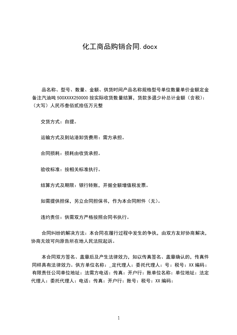 品名称、型号、数量、金额、供货时间产品名称规格型号单位数量单价金额定金备注汽油吨500XXXX250000按实际收货数量结算,货款多退少补总计金额(含税):(大写)人民币叁佰贰拾伍万元整